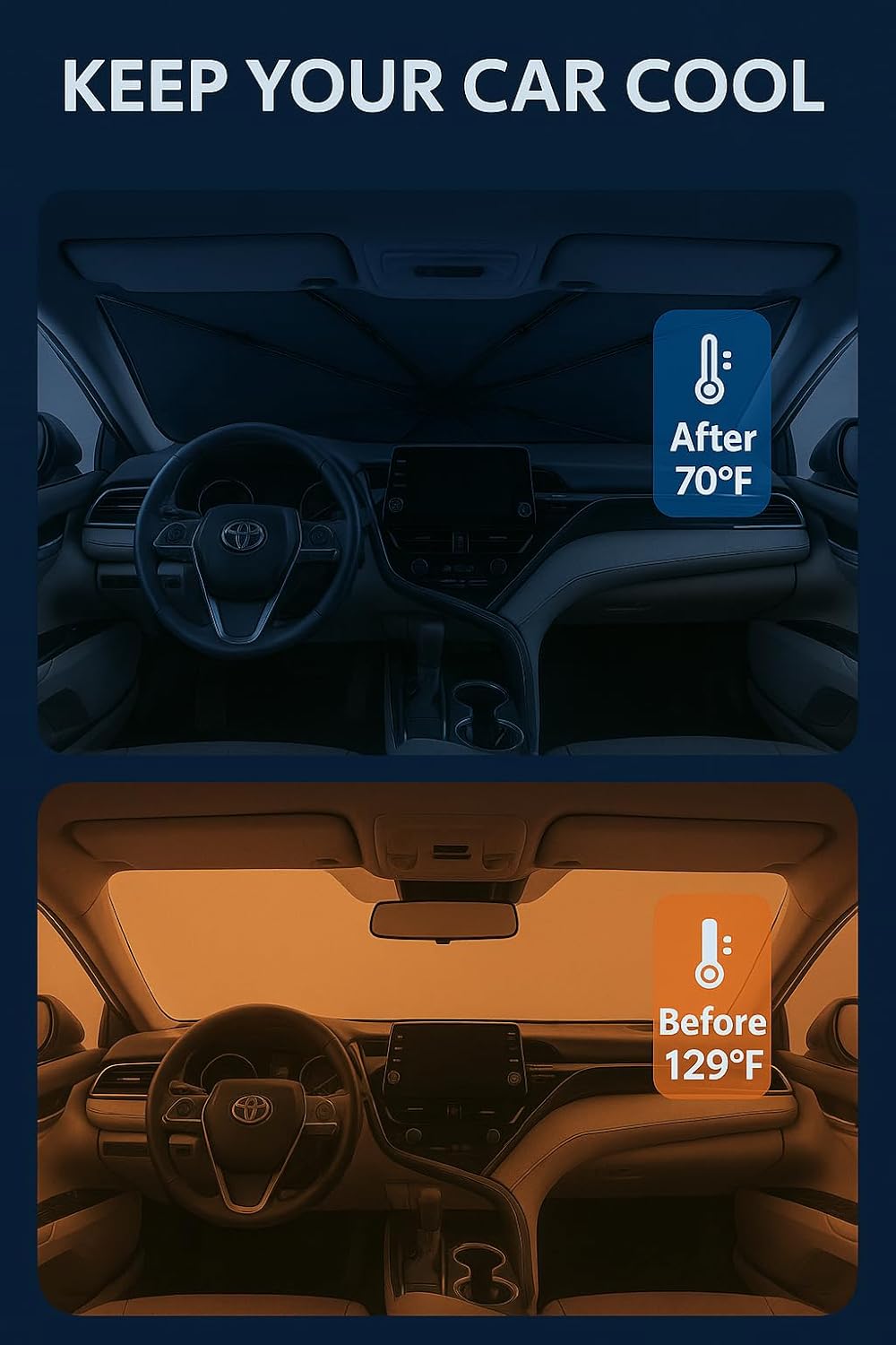 - Certified Sustainable. Customized Windshield Sunshade: Specially designed for the 2018-2025 Toyota Camry with precise mirror cutouts, providing 100% shading, carbon fiber handle, ensuring lightweight and durability while also having a fashionable feel. Our Camry windshield sunshade can protect the interior of your car from various light damage and prevent dashboard and seat degradation.