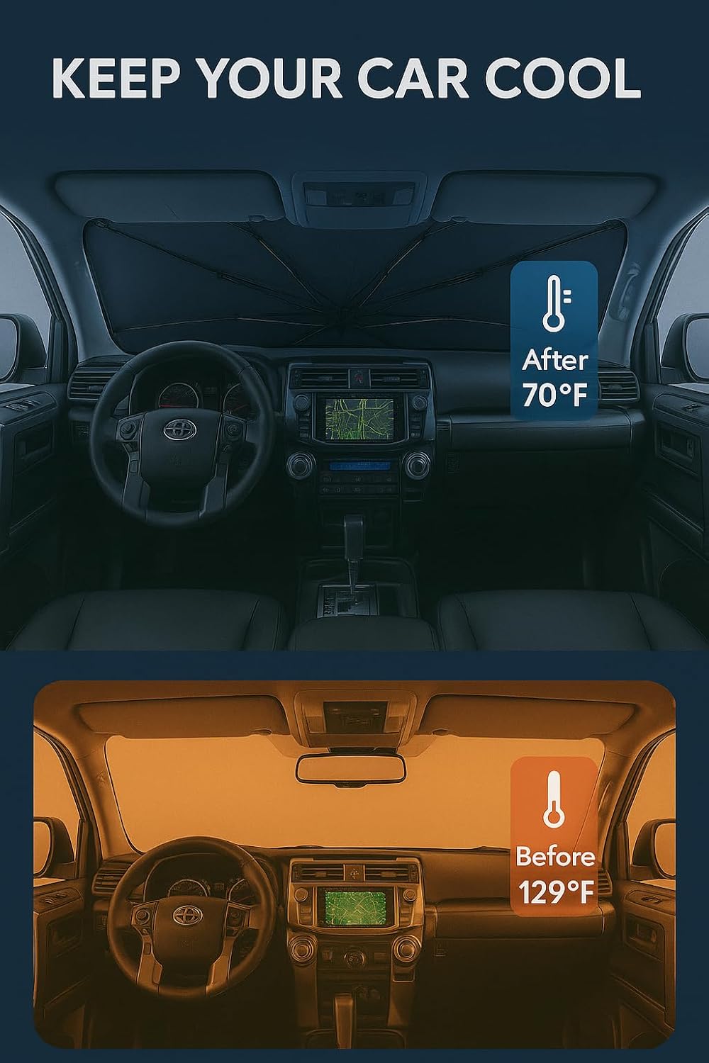 - Innovative Ice Crystal Material: The sunshade adopts a 4-layer design, which is thick enough to effectively block and reflect sunlight. After multiple uses, it is still strong and not easy to tear. The sunshade also uses innovative ice crystal materials to evenly distribute heat, quickly cool down, and keep your car cool all the time. You no longer have to worry about getting your seat or car handle scalded by high temperatures.