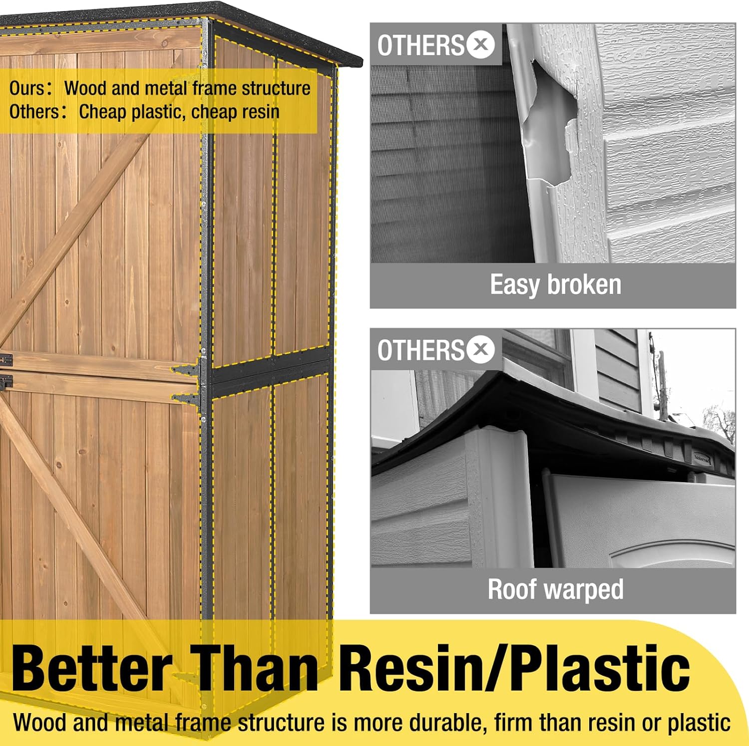 - Weatherproof Outdoor Storage Solution: Made with weather-resistant solid wood and a sloped roof to prevent water accumulation. Ideal for storing tools, lawn gear, cleaning supplies, or pool accessories