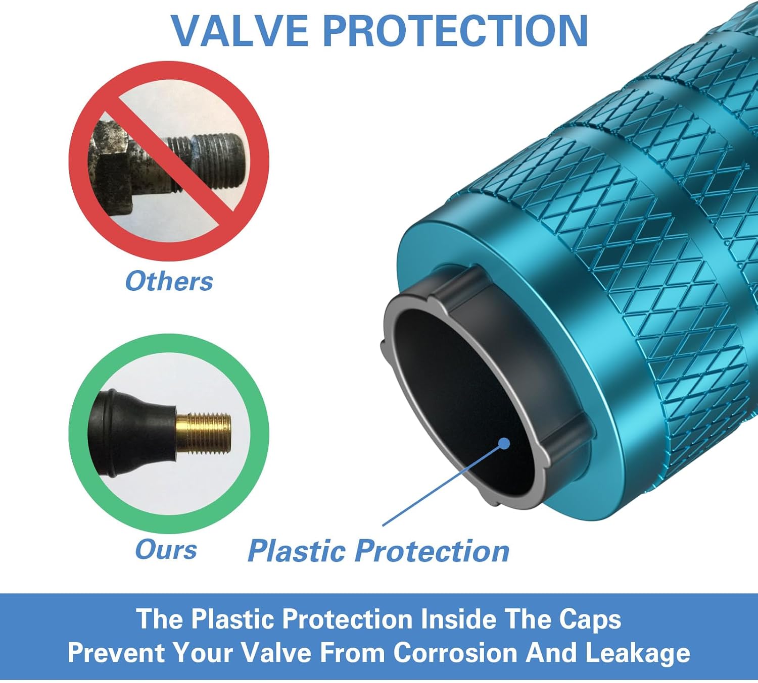 - Special Design – Metal materials are prone to rust in the presence of water and oxygen, which may lead to corrosion on valve body. The plastic inner valve caps design combines the attribution of corrosion resistance of plastic and the stylish look of metal.
