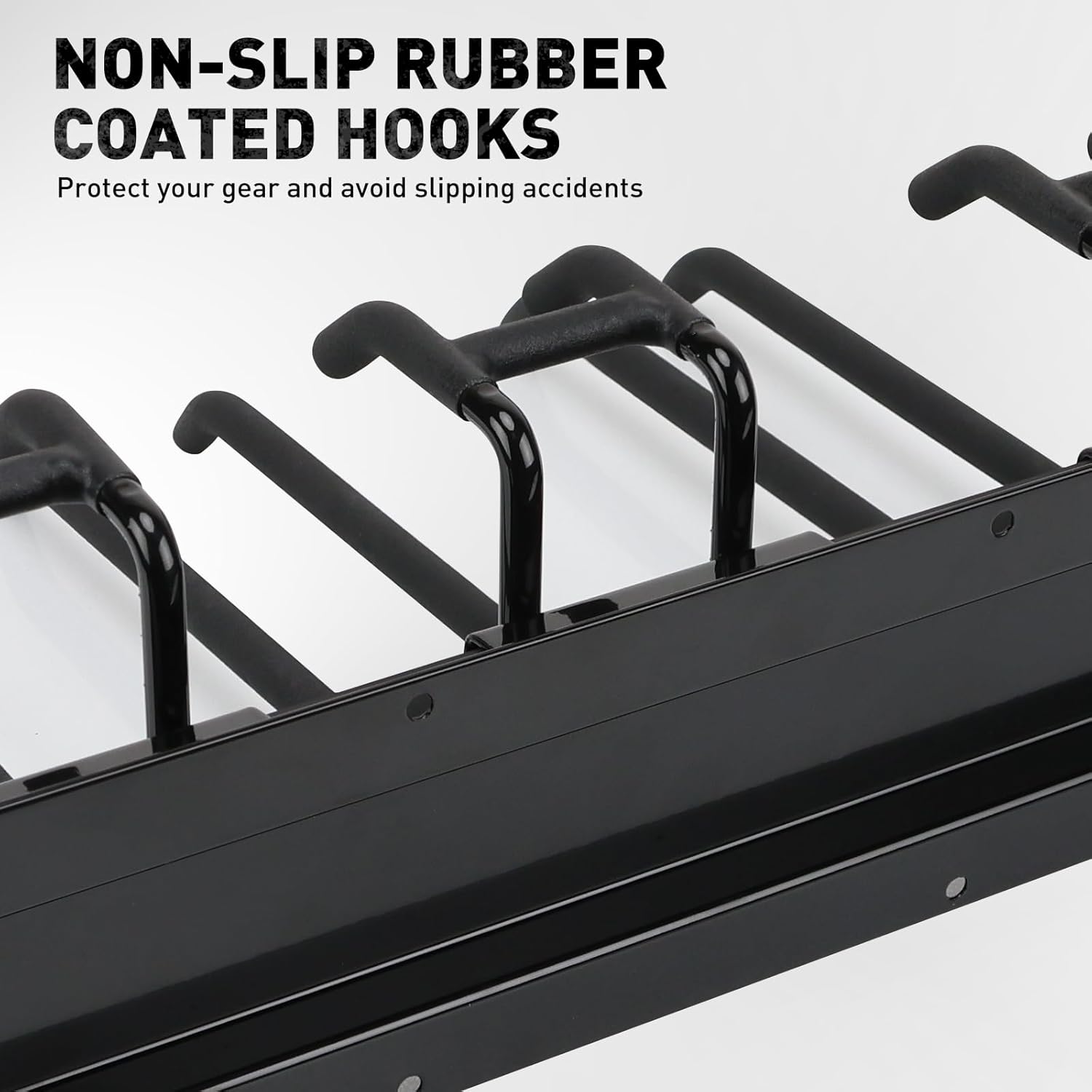 - PROTECTIVE HOOKS - Rubber-coated double hooks keep tools from slipping or scratching while adding a premium look. Ideal for yard tools, garden gear, sports equipment, and more in your garage storage setup.