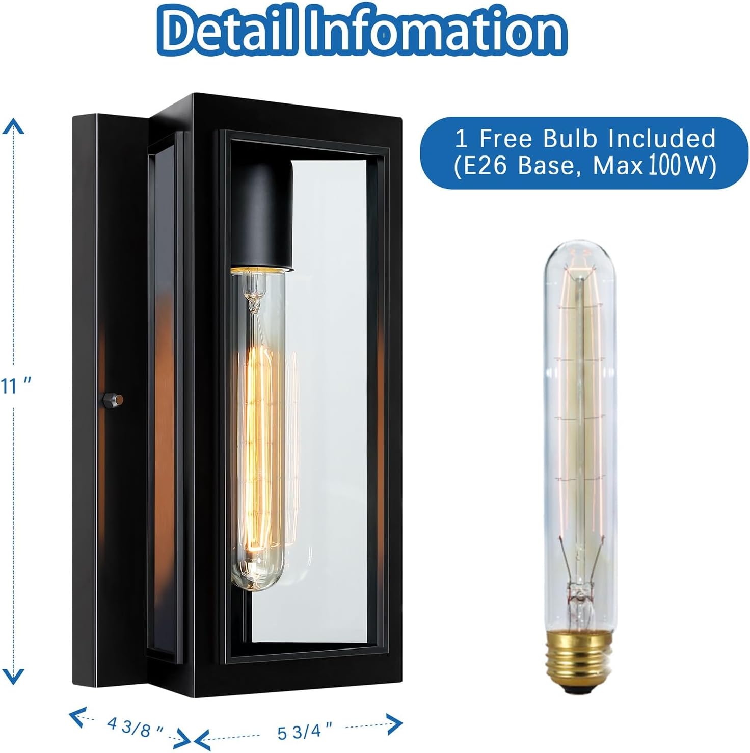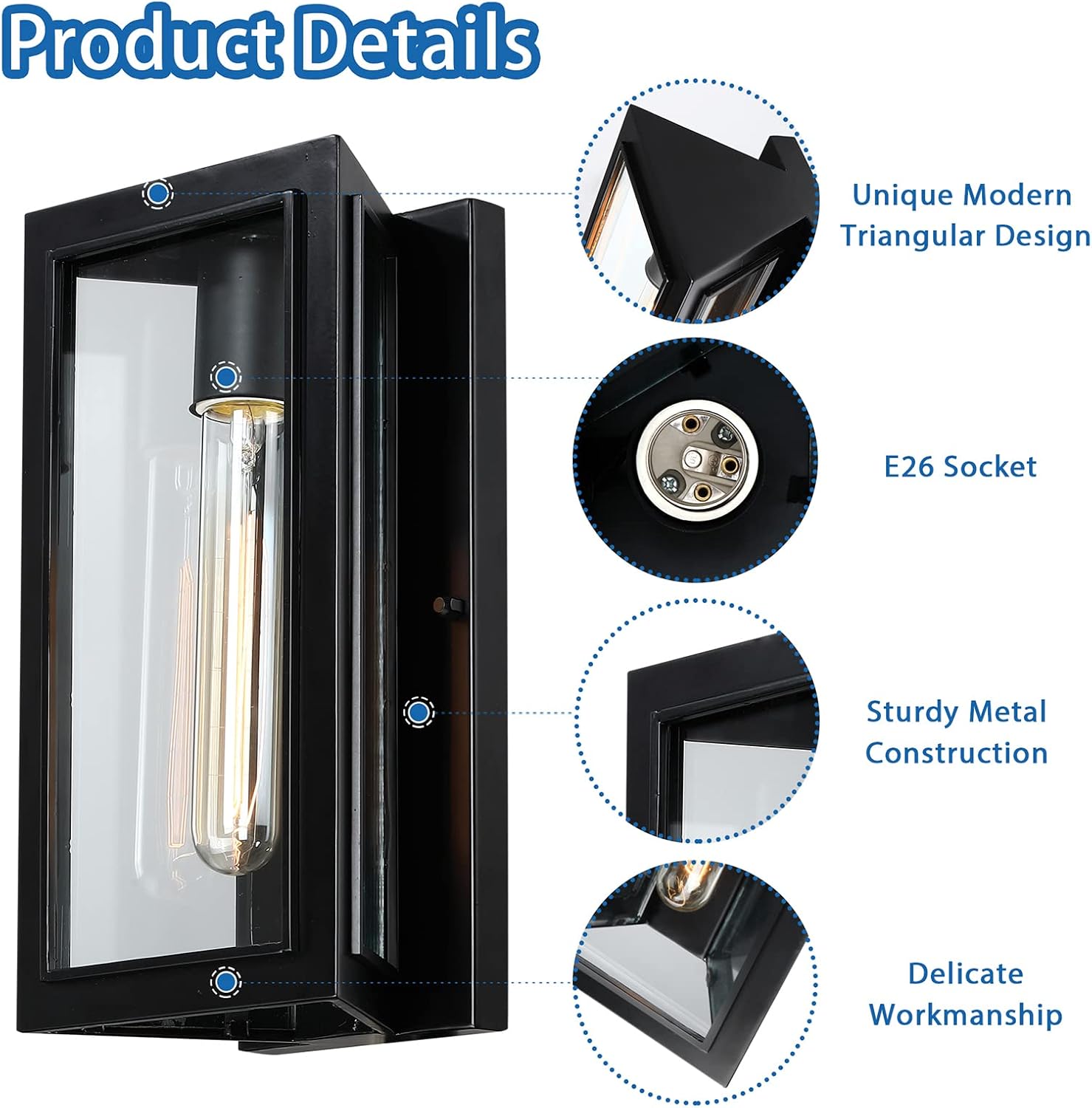 - 【Weather Resistant】Constructed with sturdy metal frame and thicken glass panel, Our black outdoor wall sconce is waterproof and durable enough to withstand any weather changes, like cloudy, heavy rain, snowy, icing, hot weather, etc. The high-quality metal effectively prevents the wall light from rust or corrosion to keep its stylish look for years of usage.