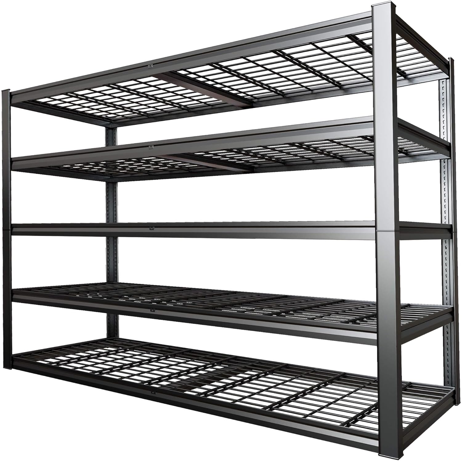- ăHeavy-Duty Reinforced Metal ConstructionâăCrafted with extra-thick, widened, and hardened steel, this 5-tier garage shelving unit delivers unmatched durability for long-term storage. The all-metal build ensures robust support, ideal for heavy tools, equipment, and bulky items.