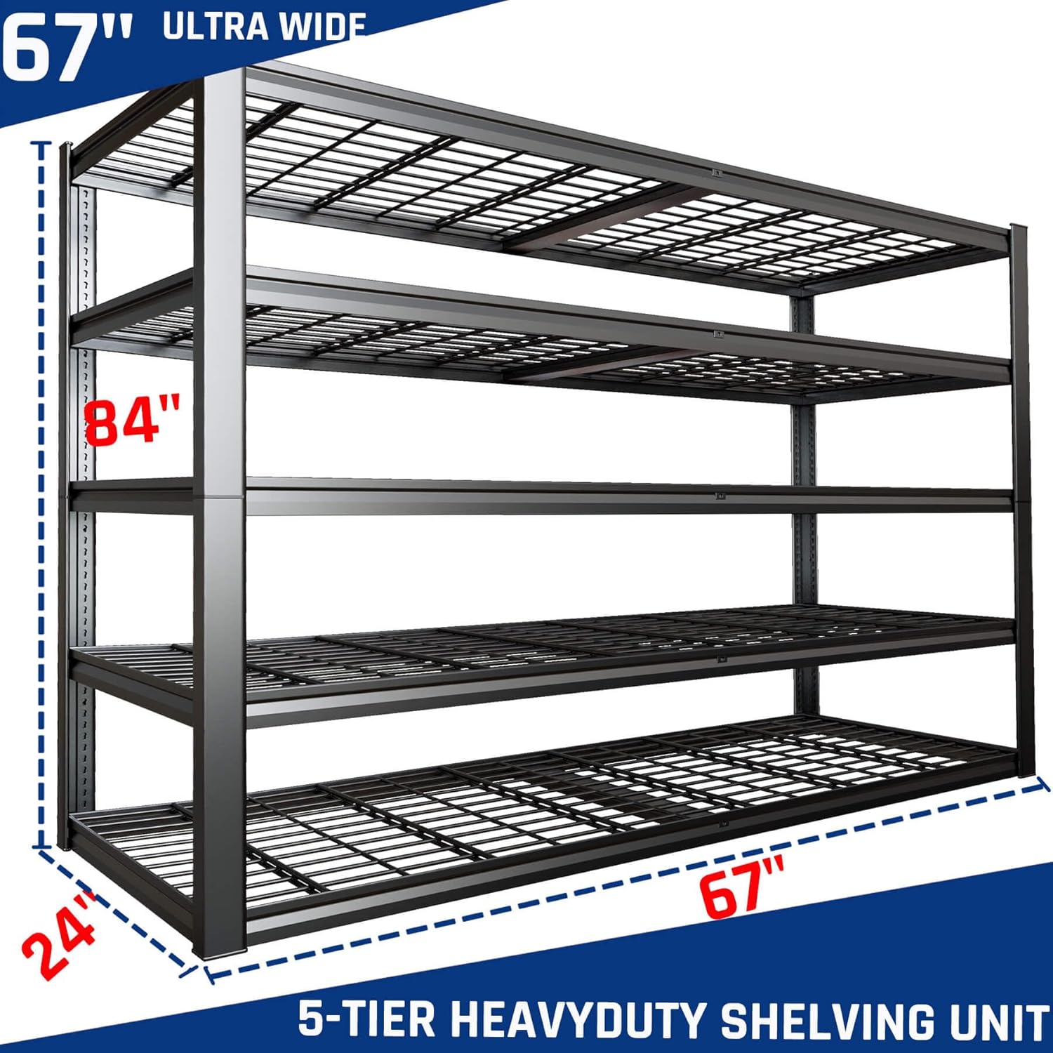 - ăâDouble-Layer Wire Deck & Assembly in 15 MinutesâăThe dual-layered steel mesh design prevents sagging and evenly distributes weight. Paired with a 67"W x 24"D x 84"H footprint, it maximizes garage, basement, or warehouse storage without compromising floor space. âQuick & Hassle-Free Assembly in 15 MinutesâïŒ Enjoy a no-nuts, tool-free setup! The innovative interlocking design allows effortless installation within 15 minutes, saving time while maintaining a rock-solid structure.