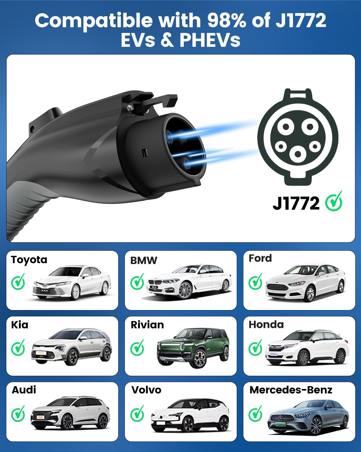 - 【SAE J1772 Connector – Works with Most Major EVs】This J1772 charger is equipped with SAE J1772 coupler and is compatible with a wide range of popular electric vehicles, including models from Ford, Chevrolet, Hyundai, Audi, Nissan Ariya, Rivian R1S, Kia, and more. Please note: It is not compatible with Tesla vehicles or vehicles with NACS charging port without a J1772-to-Tesla adapter (sold separately)