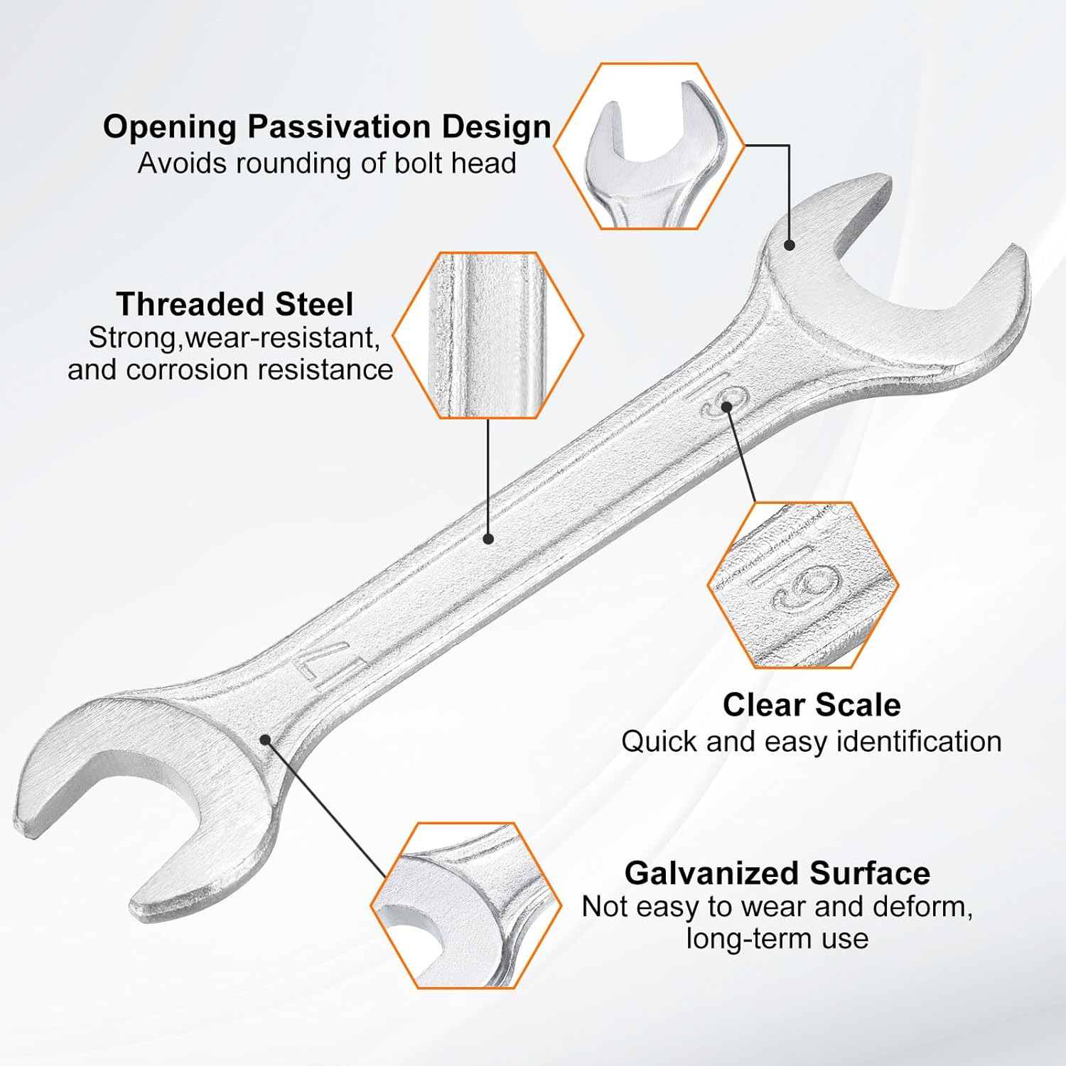 - Material - Our double open-end wrench is made of threaded steel with high hardness and excellent wear resistance. The surface galvanizing improves its wear resistance, keeps its surface smooth and reduces wear, is not easy to deform, and can be used for a long time.