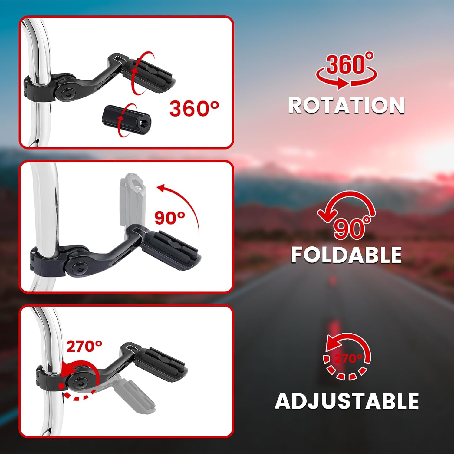 - Adjustable: Retractable highway pegs can 360° rotation, it's convenient for you to adjust the angle according to their needs. 270° Adjustable allows to up or down adjustment. 90° foldable allows to retract the footpeg by folding it upward 90°