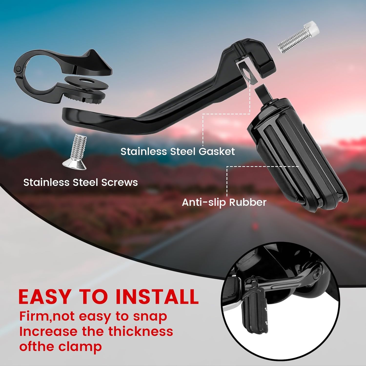- Easy installation:The item easy to install, No drill installation and mounting clamp firmly grips the engine guard, and secures the peg at the desired angle; Please contact us by Amazon email if you have any questions