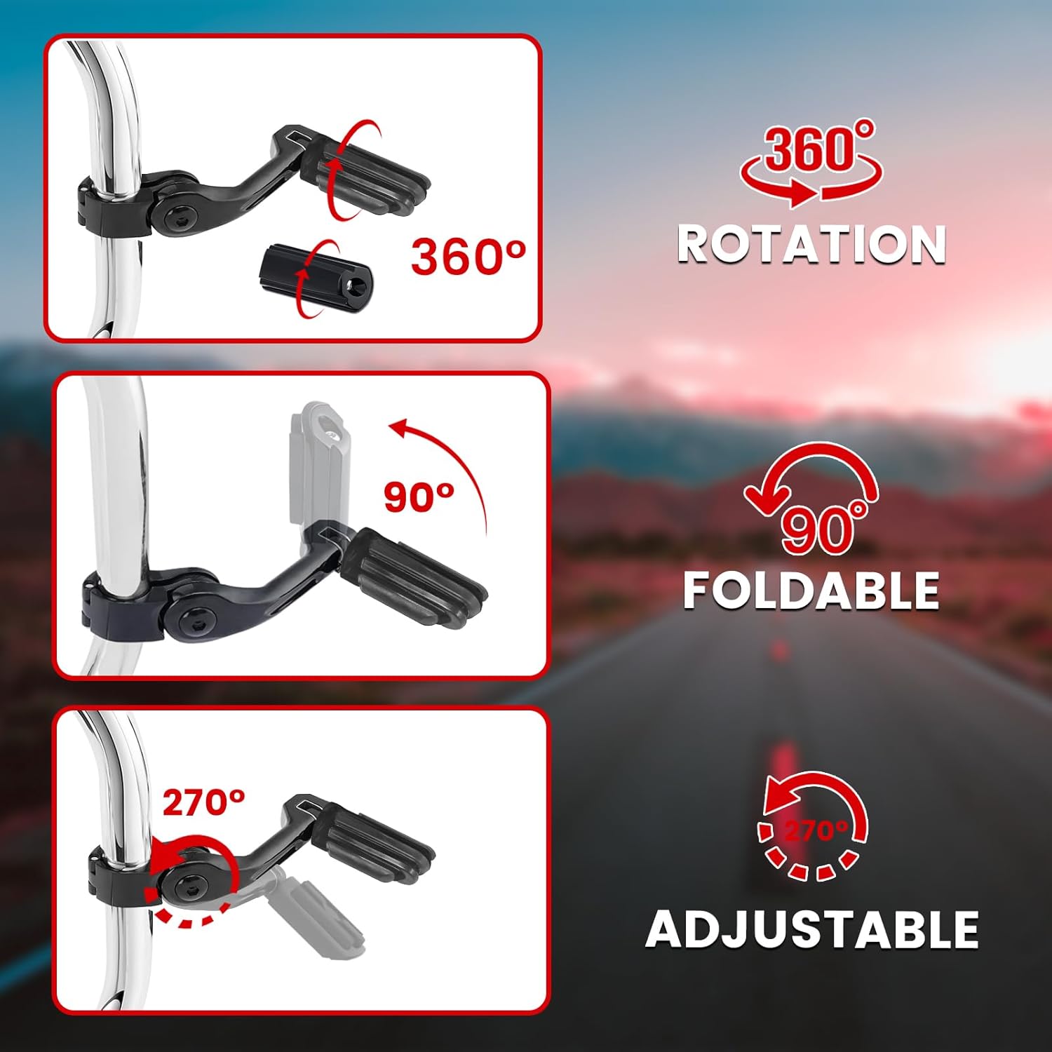 - Adjustable: Retractable highway pegs can 360° rotation, it's convenient for you to adjust the angle according to their needs. 270° Adjustable allows to up or down adjustment. 90° foldable allows to retract the footpeg by folding it upward 90°