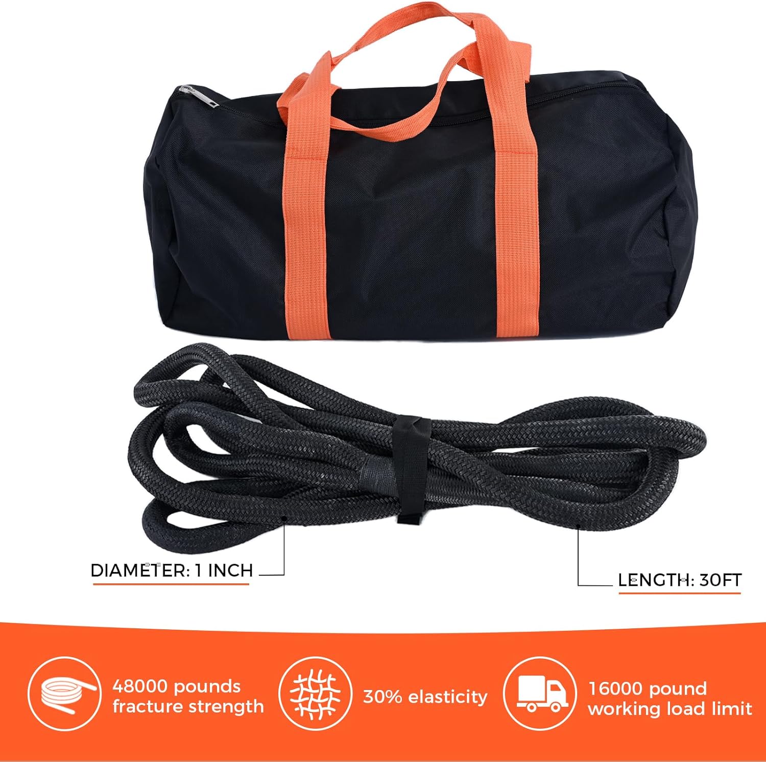 - PROFESSIONAL GRADE RESCUE ROPE: The 1 "x30ft kinetic recovery tow rope is made of 100% nylon and double braided construction for exceptional durability and reliability. With a breaking strength of up to 48,000 LBS and 30% elasticity to better prevent it from snapping during handling, it's an indispensable tool for towing, rescue, and other heavy-duty work in harsh environments.