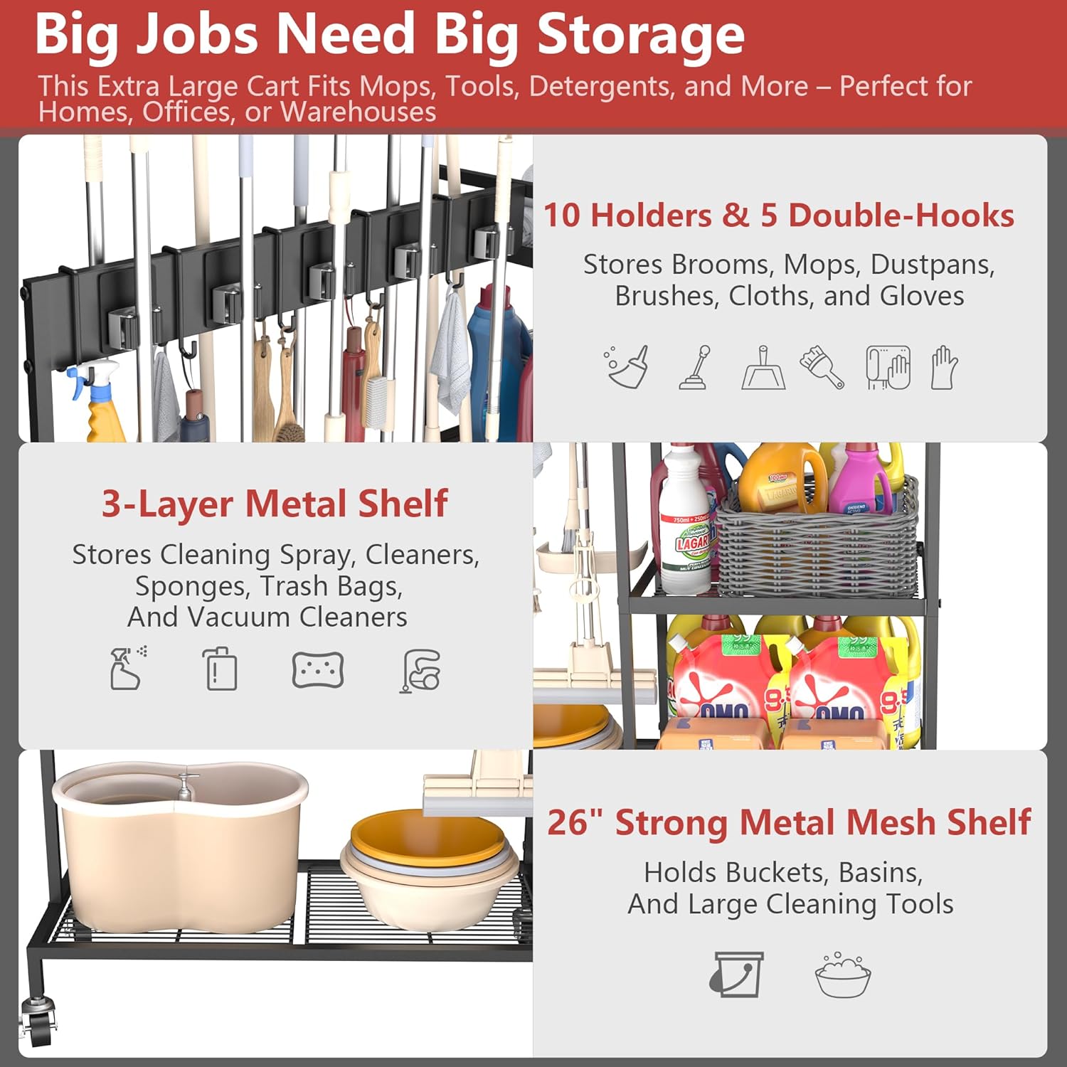 - đ§° ăUltimate Tool Organization: Holds 10+ Tools & SuppliesăCommand your cleaning arsenal! Features: 10 adjustable mop/broom clips, 5 heavy-duty hooks for bottles & gloves, 3 spacious shelves for buckets & supplies. End scattered tools â everything has its place!