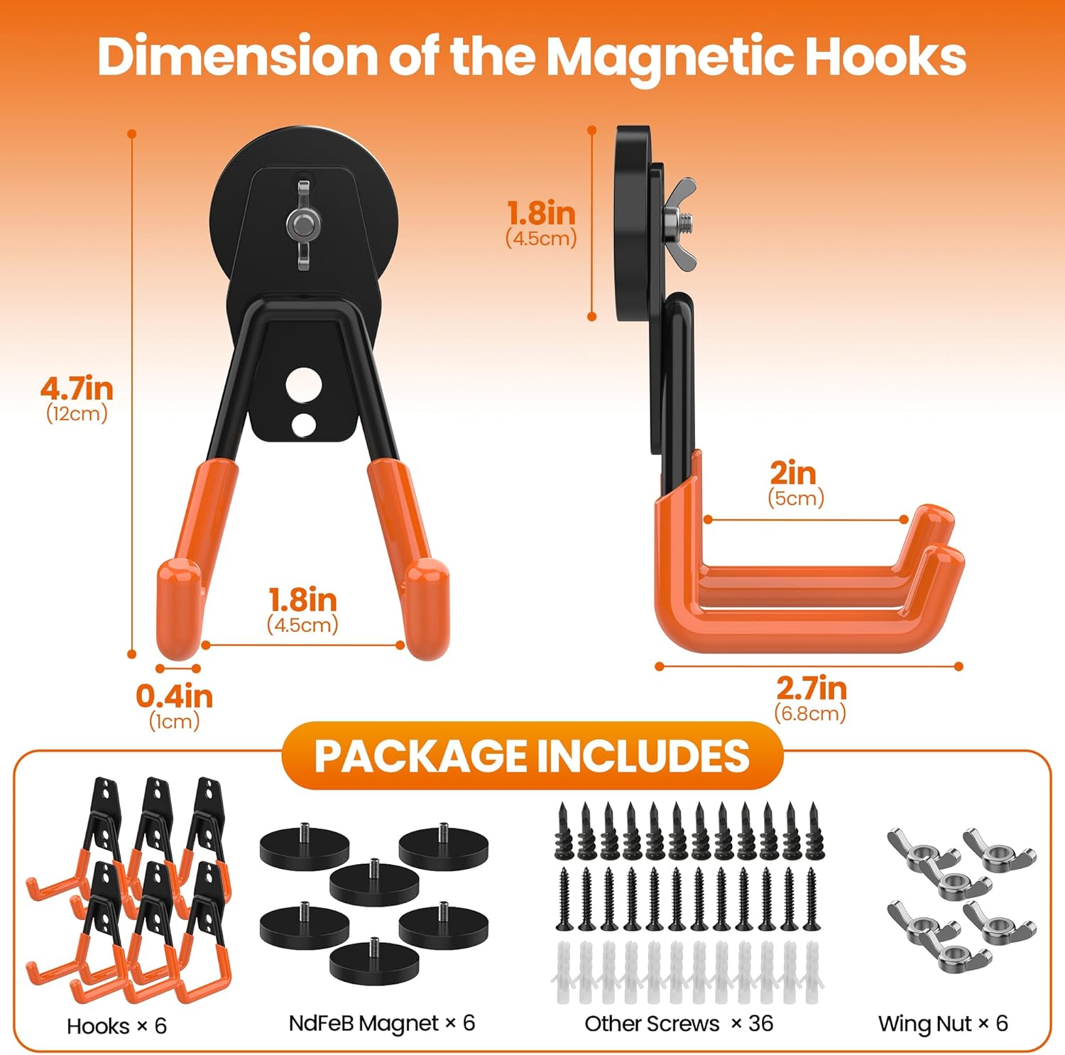- 【Super Strong Magnetism & Sturdy Structure】 Each magnet hooks heavy duty features magnet base embedded with 6 industrial-grade rare earth neodymium magnets, ensuring powerful adsorption and reliable load-bearing. Made of thick, high-quality steel, these magnetic tool hooks provide a stable hold for heavy tools like power drills, hammer, air tools, shovels, rakes, ladders, toolboxes, toolchests, wrenches, tool carts, as well as daily items such as brooms, mops, dustpans, hoses, gym bags, backpacks, kitchen utensils, dog leashes, wires, straps, ropes, extension cords, clothes, and wreaths