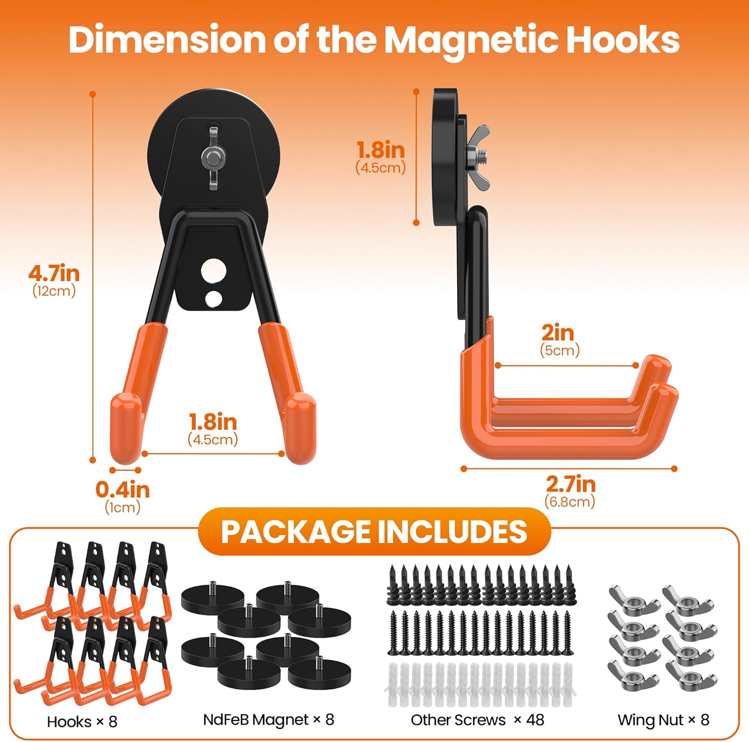 - 【Multi-Pack Magnetic Hooks Heavy Duty】 Our strong magnetic utility hooks are upgraded with high-performance neodymium magnets, offering a versatile storage solution for homes, garages, workshops, kitchens, gardens, and more. With 8 Pack large magnetic hooks in one set, they meet daily storage needs for both light and heavy items, keeping your space organized and clutter-free