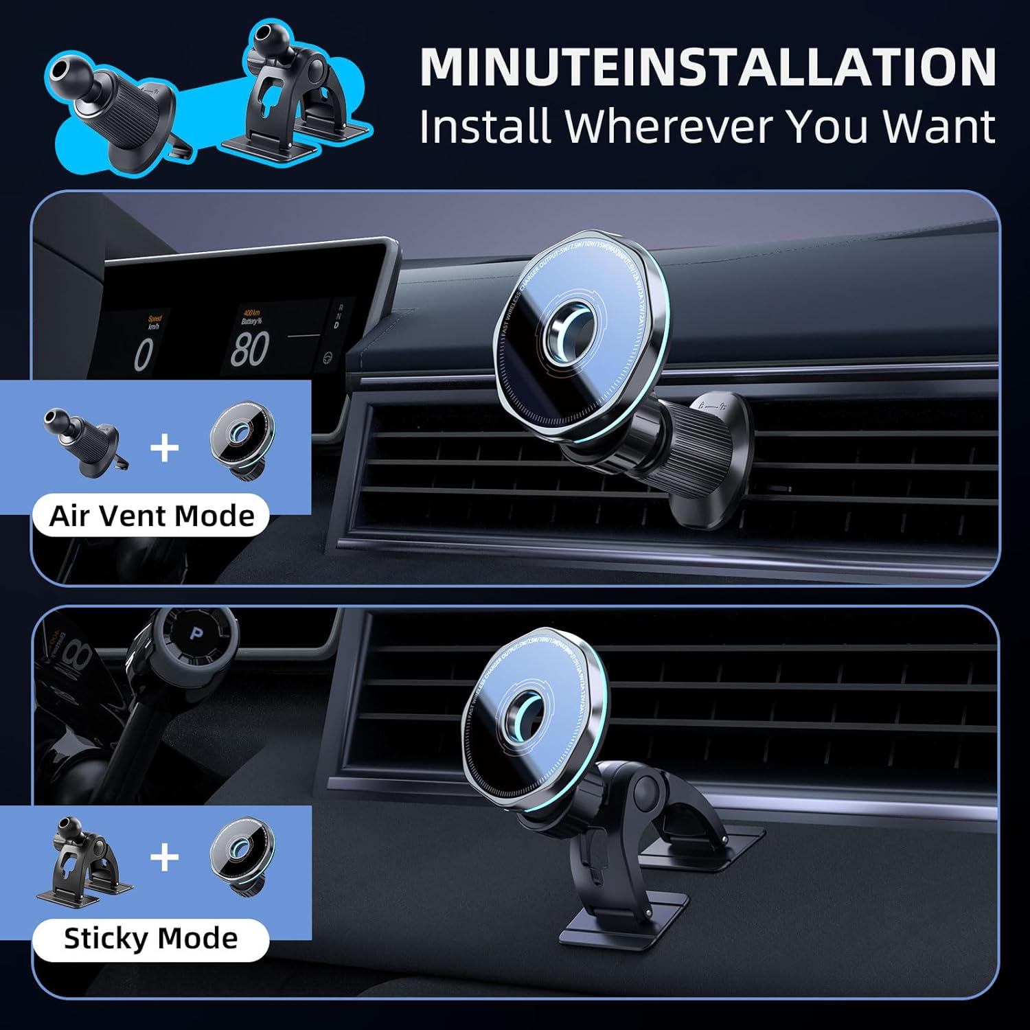 - ✅【15W Fast Wireless Charging – Optimized for MagSafe】Enjoy ultra-efficient, stable charging with this magsafe car mount charger, delivering up to 15W of power. Just snap your iPhone onto the magnetic phone mount, and it instantly aligns with the coil for seamless charging. Note: Use an 18W+ QC adapter (not included) for optimal speed.