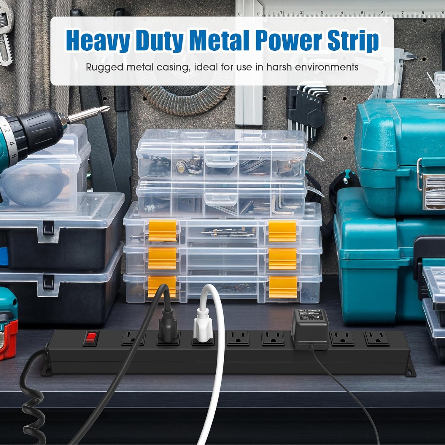 2Pack 8 Outlet Metal Wall Mount Power Strip, Mountable Outlet with Switch, Heavy Duty Wide Spaced Surge Protector, 6 FT SJT 14AWG Black Spring Cord.