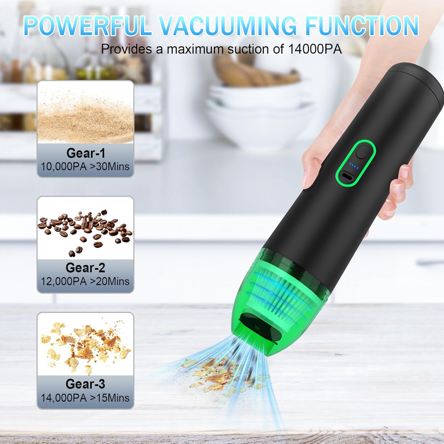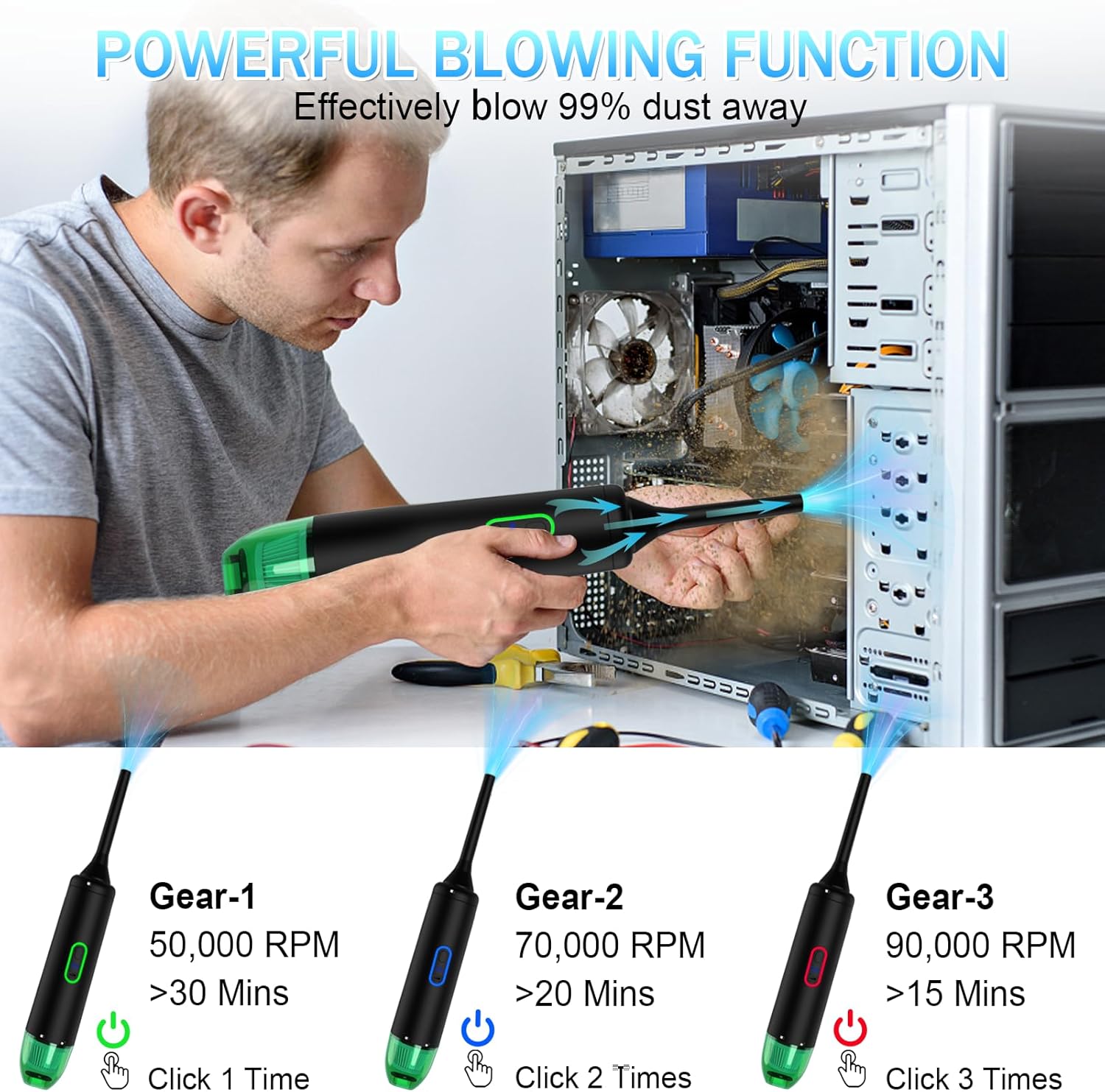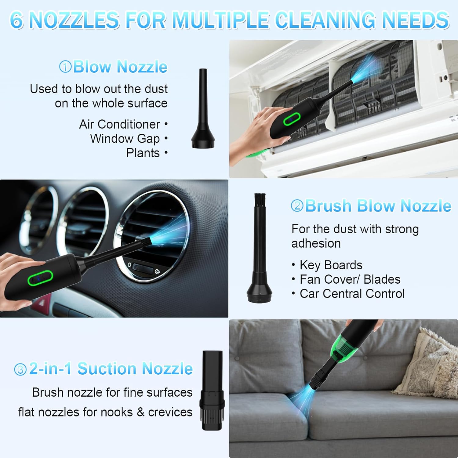- 【2-in-1Vacuuming & Blowing Function】 Handheld vacuum combines powerful vacuuming and blowing functions in one compact device. With a high-speed airflow of 90,000 RPM, it effortlessly cleans computer keyboards, lenses, car interiors, and even helps ignite flames or clear debris from tight spaces during grilling