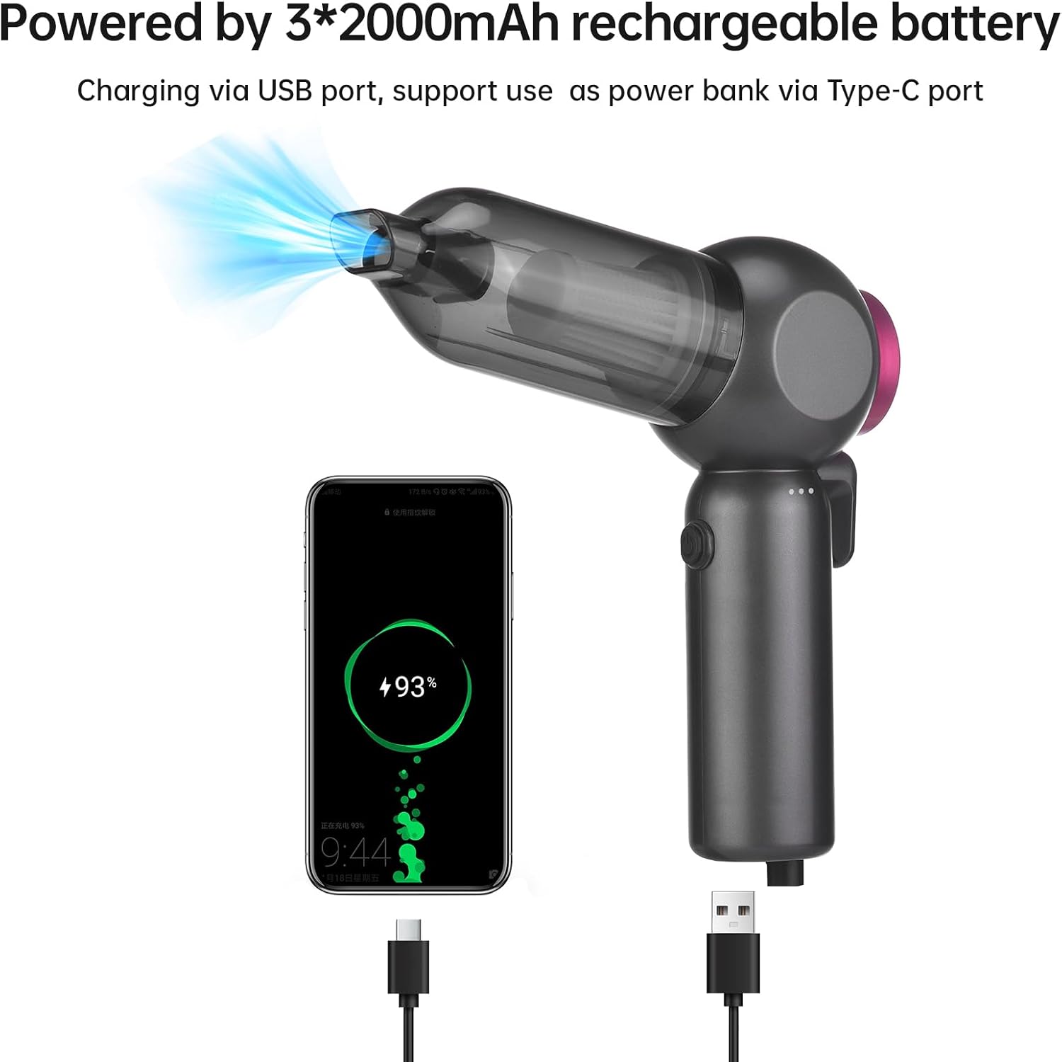 - ăTwo Different Charging InterfacesăThe car vacuum portable cordless is equipped with a built-in 3 * 2000mAH battery, which is rechargeable and reusable, making it more environmentally friendly and energy-efficient. The 6-in-1 car vacuum cleaner has two different charging ports. One uses a Type-C data cable to charge the vacuum cleaner, and the green indicator light can promptly remind you that the battery is fully charged. A USB charging cable that can be plugged in to connect the other end to a device that needs to be charged, such as a phone, tablet, etc.