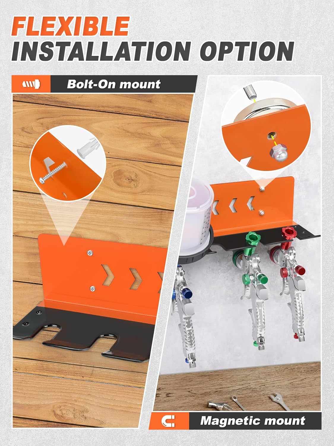 - Organized Tool Storage: Stores up to 7 gravity feed spray guns without cups, or 4 with cups. The open design keeps your tools visible, accessible, and neatly lined upโmaking every paint job smoother from start to finish