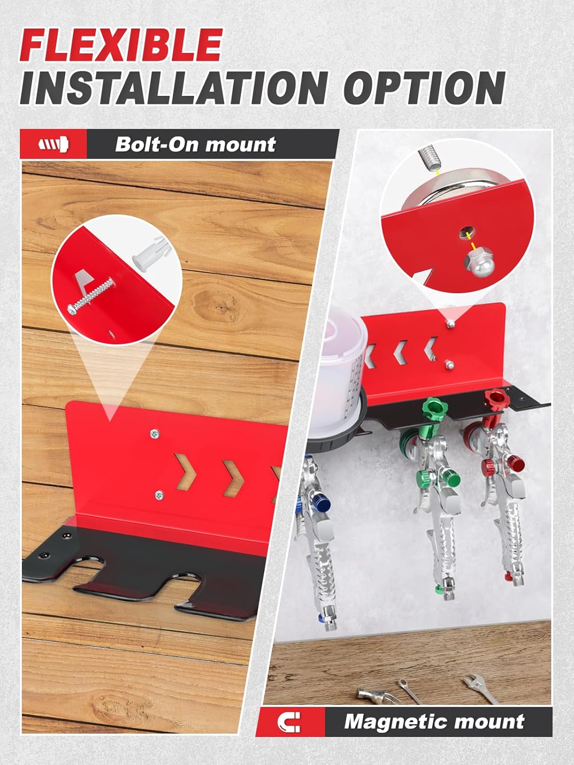 - Organized Tool Storage: Stores up to 7 gravity feed spray guns without cups, or 4 with cups. The open design keeps your tools visible, accessible, and neatly lined upโmaking every paint job smoother from start to finish