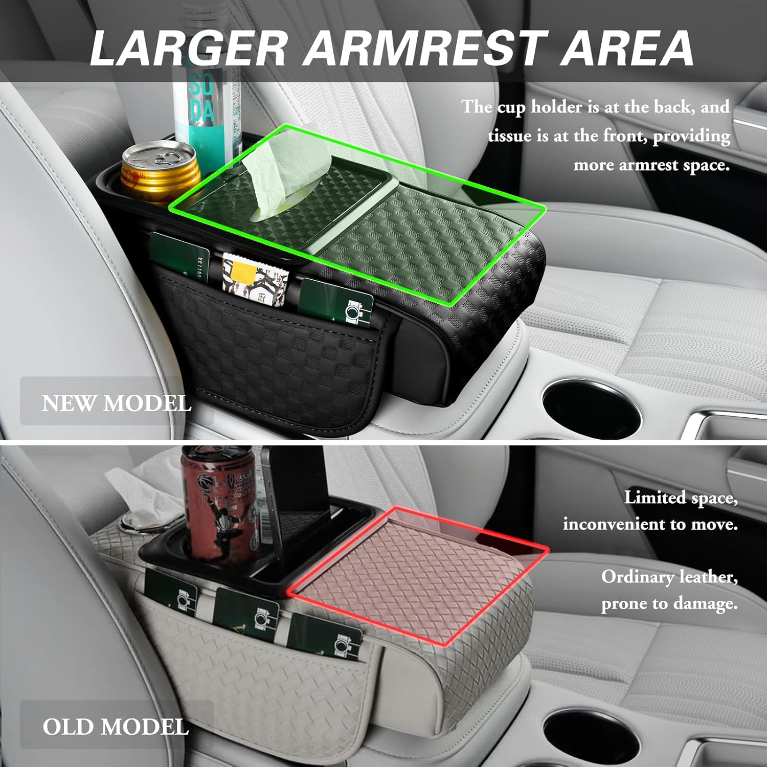- 10" × 8" Extra-Large Armrest Area: We have designed a front tissue storage and rear cup holder to ensure that the armrest area remains spacious enough (allowing you to rest your arm on the tissue box) while still providing storage functionality, thus preserving the original purpose