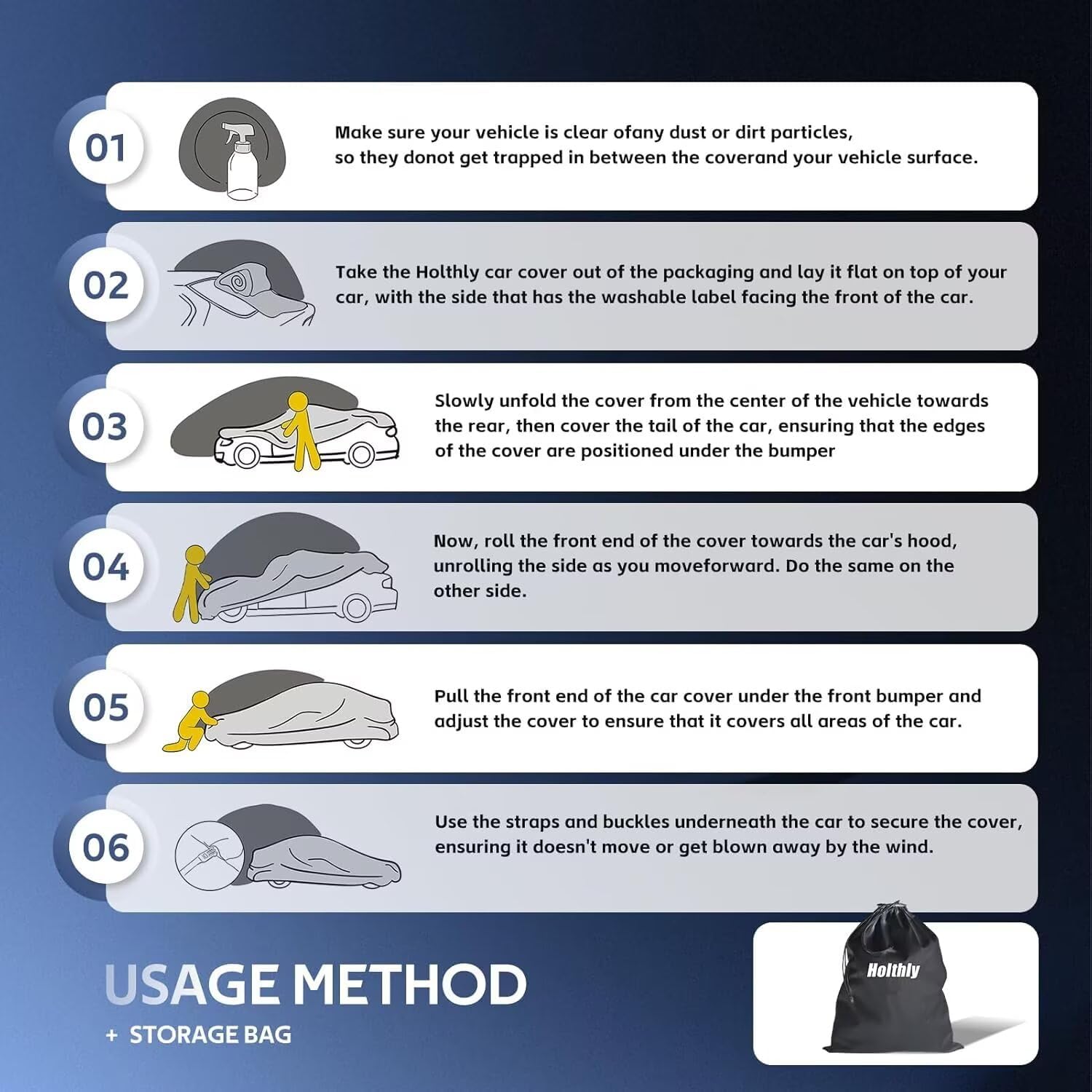 - ăProduct Detailsă -1.The Holthly car cover features three pairs of reinforced windproof straps to keep it securely in place, even in high winds.2.A spacious storage bag is included for easy folding and transport in your trunk.3.Double stitching along the edges ensures greater durability.4.Four reflective strips are added to enhance visibility and help prevent accidental collisions at night.
