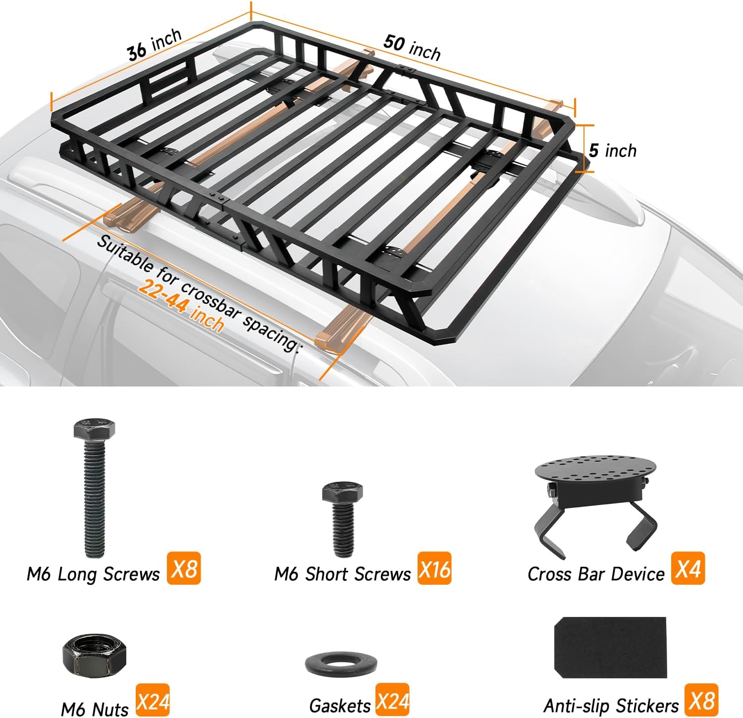 - ăSpacious DimensionsăMeasuring 50" x 36" x 5", this roof rack cargo carrier provides ample space for your gear. Designed to fit vehicles with crossbar spacing between 22"-44", itâs a perfect fit for most SUVs, RVs, trucks, and pickups.
