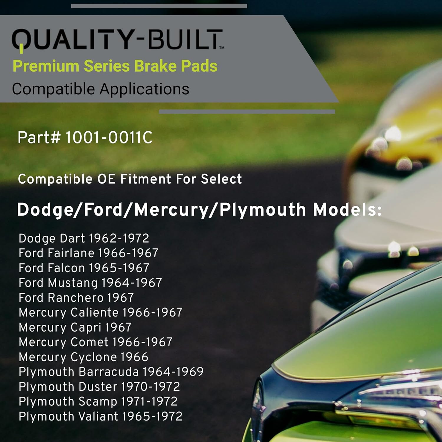 Premium Ceramic Front Brake Pads (1001-0011C) Compatible with 1962-1972 Dodge/Ford/Mercury/Plymouth (Barracuda/Caliente/Capri/Comet/Cyclone/Dart/Duster/Fairlane/Falcon/Mustang/Ranchero)