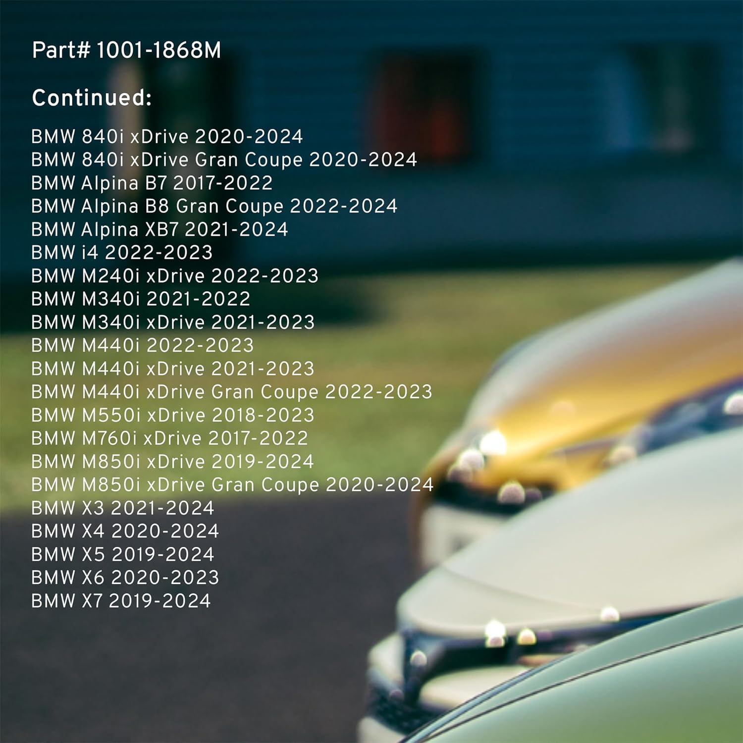 - FITMENT LIST: Select Models 2016-2024 BMW (1001-1868M) Verify Fitment using AmazonConfirmedFit tool.