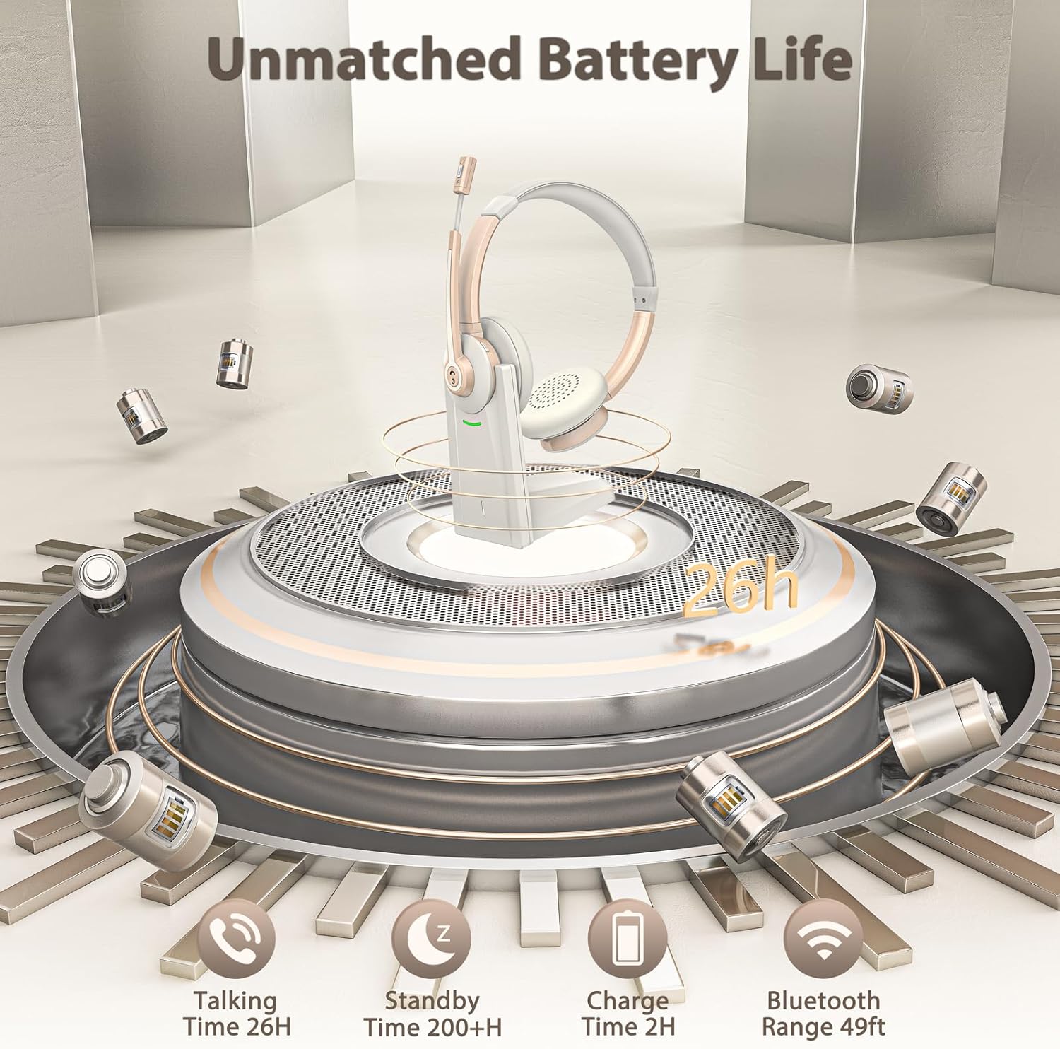 - 【Long Battery Life with Charging Dock】Wireless headset with mic for work provide up to 26 hours of continuous talk and 160hours of standby time on a single charge. In addition, this laptop wireless headset comes with a plug-and-play charging dock, which you can use for wireless charging or a TYPE-C charging cable. It's perfect for both office shifts and long road trips.