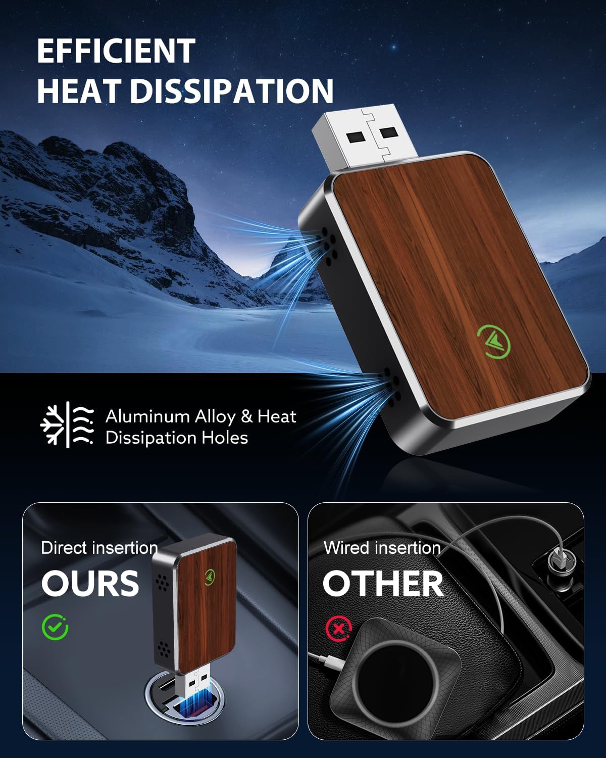 - Seamless Wireless Upgrade: Instantly convert your factory-wired CarPlay into a clean, wireless system with this premium adapter featuring a silver aluminum frame and smooth wood grain surface. It retains full functionality—navigation, music, Siri, calls—via your car’s original CarPlay interface. Enjoy cable-free convenience and a polished look that blends into modern interiors without requiring any app or permanent installation.