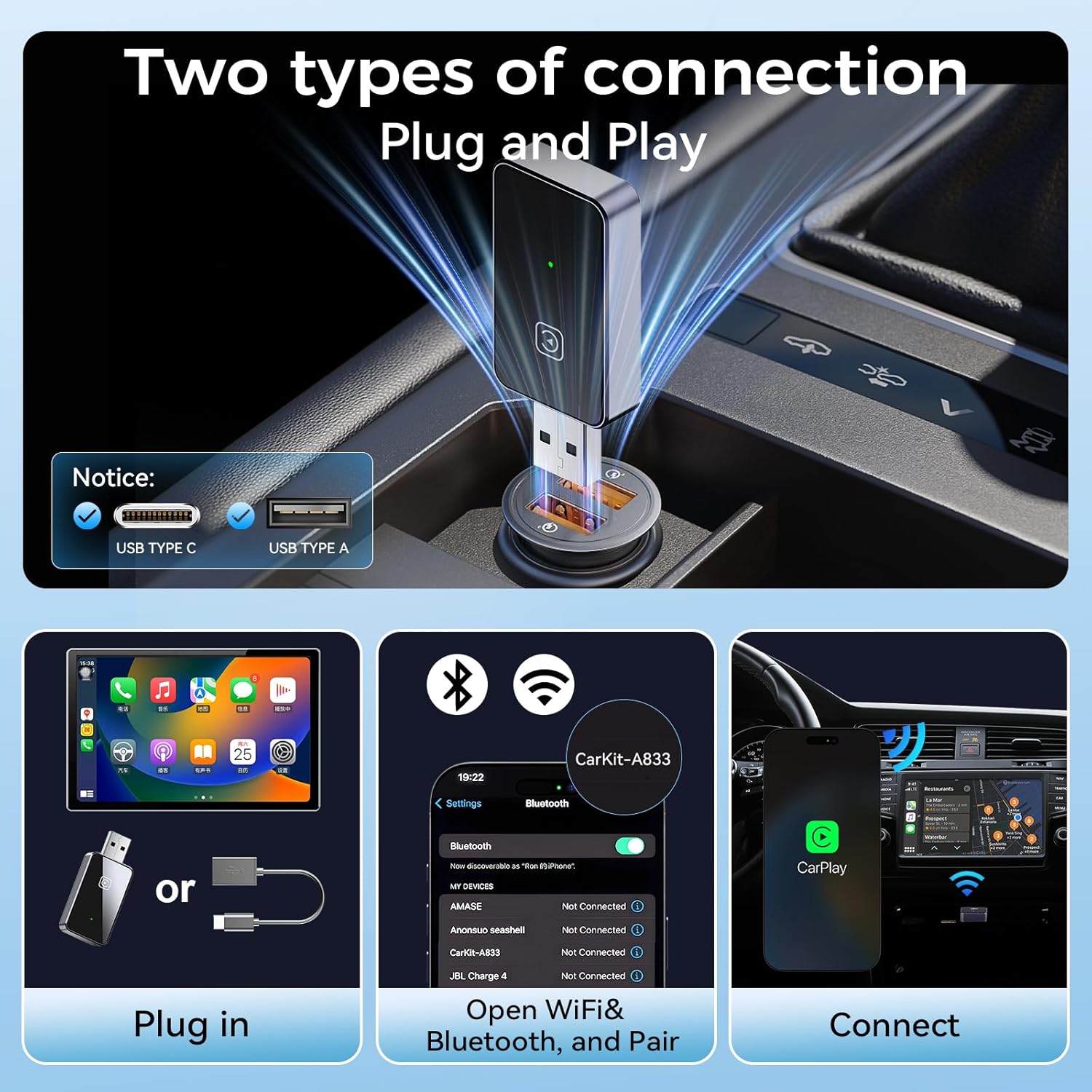 - 【Plug and Play】Simply connect your iOS phone or Android phone to a factory wired CarPlay or Android Auto equipped car (model years: 2016 to 2024), plug the wireless adapter into the USB port, and then connect to your phone via WiFi Bluetooth to work. There's no need to connect manually after that, the for apple carplay wireless adapter connects automatically as soon as the vehicle is started. Even if your phone is in your bag or pocket, it connects seamlessly for a smooth driving experience.