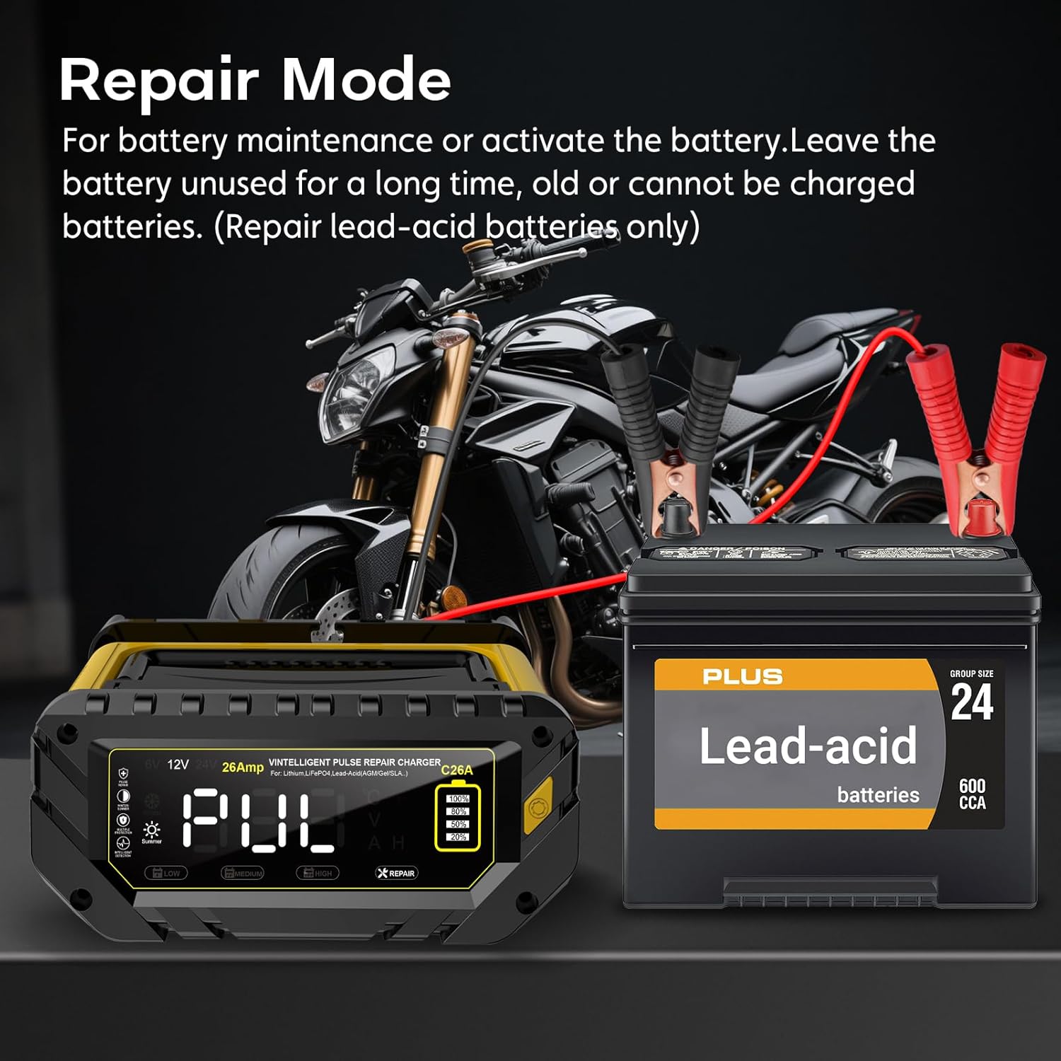 Battery Charger 0-26A 6V/12V/24V Lithium LiFePO4 Lead Acid, Fully Automatic Car Battery Maintainer, Smart Trickle Charger, Automotive w/Pulse Repair for AGM, STD, Gel, Deep Cycle Batteries