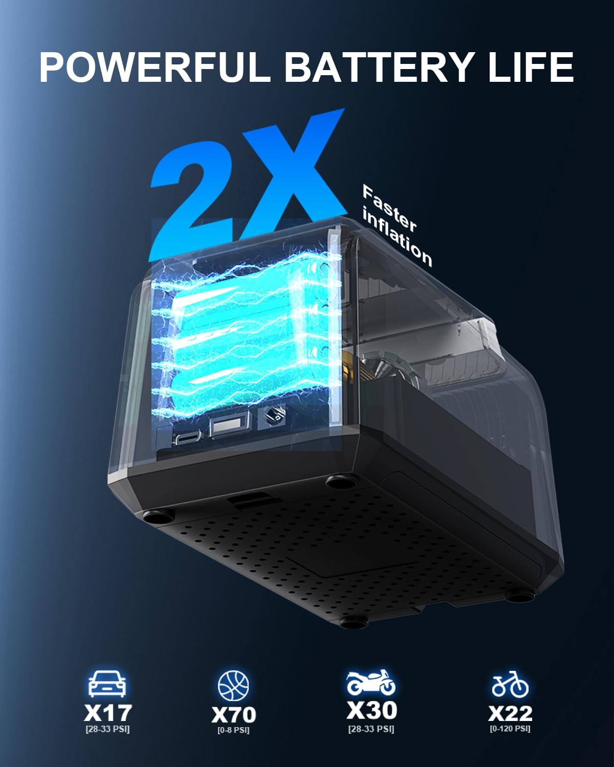 - 2X Faster Tire Inflation: The auto tire inflator portable air compressor is equipped with an advanced durability and heat dissipation management capabilities, which provides high-speed airflow and faster heat dissipation. The car tire air pump portable can quickly inflate vehicle tires within minutes, with a pressure accuracy of up to 150PSI. Suitable for car, motorcycle, bicycle, and sports balls, allows you to quickly replenish the tire pressure, making daily life and travel more convenient.