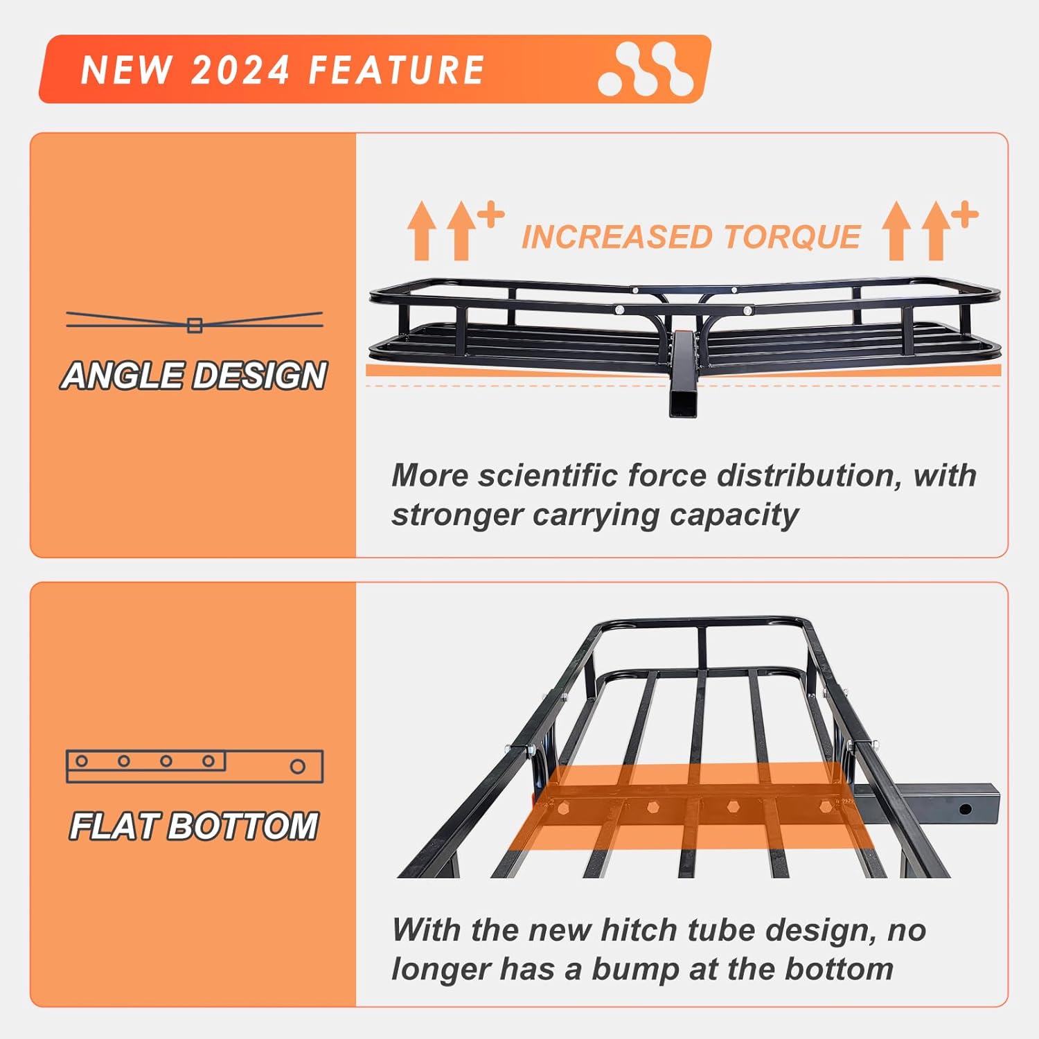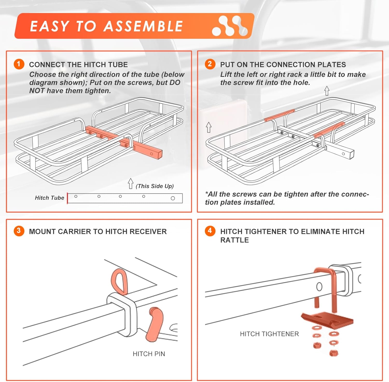 - STABLE ON THE ROAD - Heavy duty tubular steel construction and rails on all four sides provide maximum stability during travel. The hitch tightener emilinte the rattle while driving.