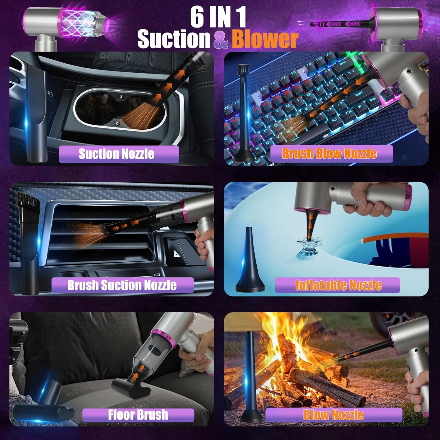 - 【7-IN-1 Accessories – Multiple Scenarios Use】 Portable vacuum cordless with floor brush,suction nozzle,brush suction nozzle,brush blow nozzle,blow nozzle,inflatable nozzle,vacuum extraction 7-in-1 accessories for cleaning pet hair, car seats, sofa dust, keyboard, floors, inflating items, and more. Includes storage bag for easy portability.
