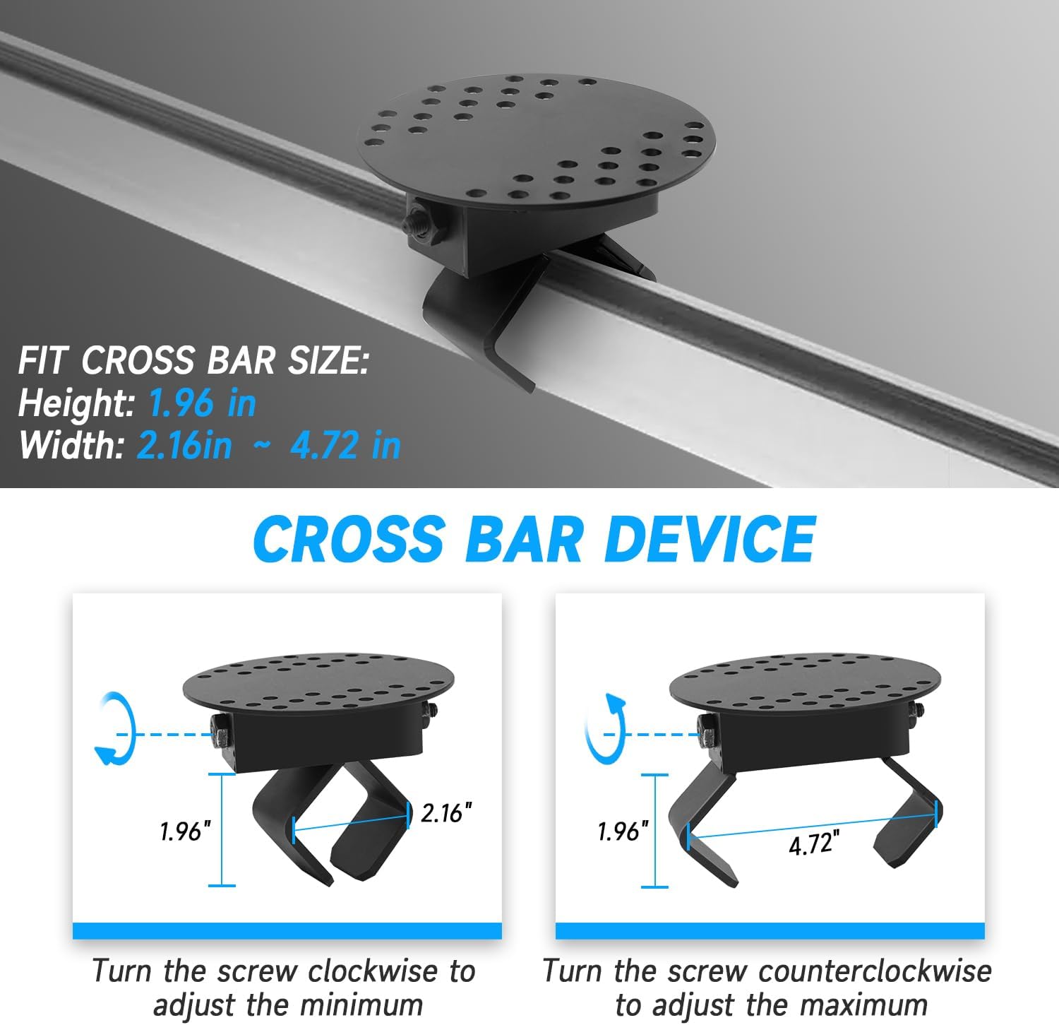 - 【Cross Bar Device】Compatible with cross bars up to 1.96" thick and 2.16" - 4.72" wide. Easily adjust the clamps by turning the screws clockwise to narrow the width or counterclockwise to expand — ensuring a secure fit for a wide range of crossbars.