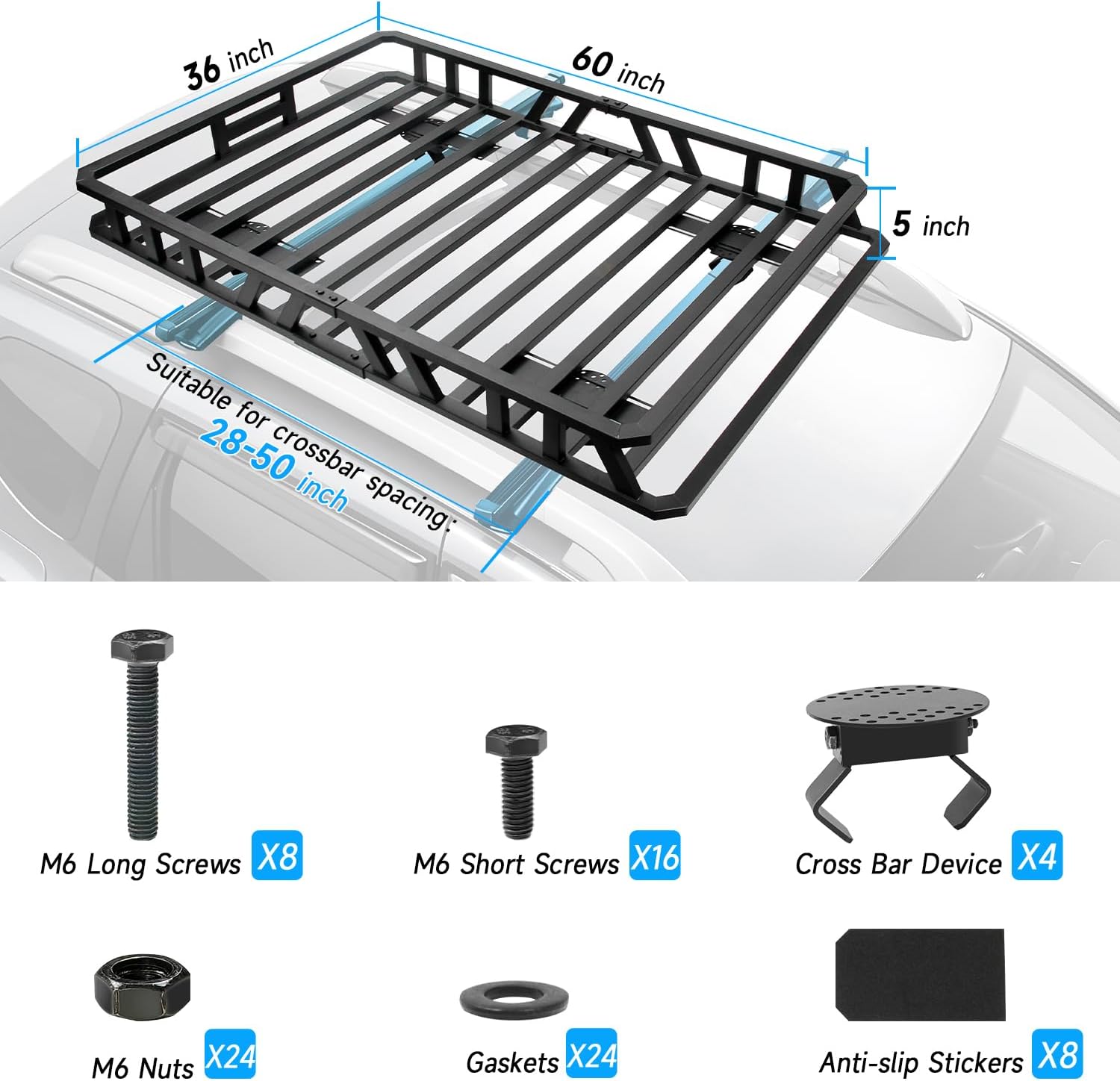 - 【Spacious Dimensions】Measuring 60" x 36" x 5", this roof rack cargo carrier provides ample space for your gear. Designed to fit vehicles with crossbar spacing between 22"-44", it’s a perfect fit for most SUVs, RVs, trucks, and pickups.