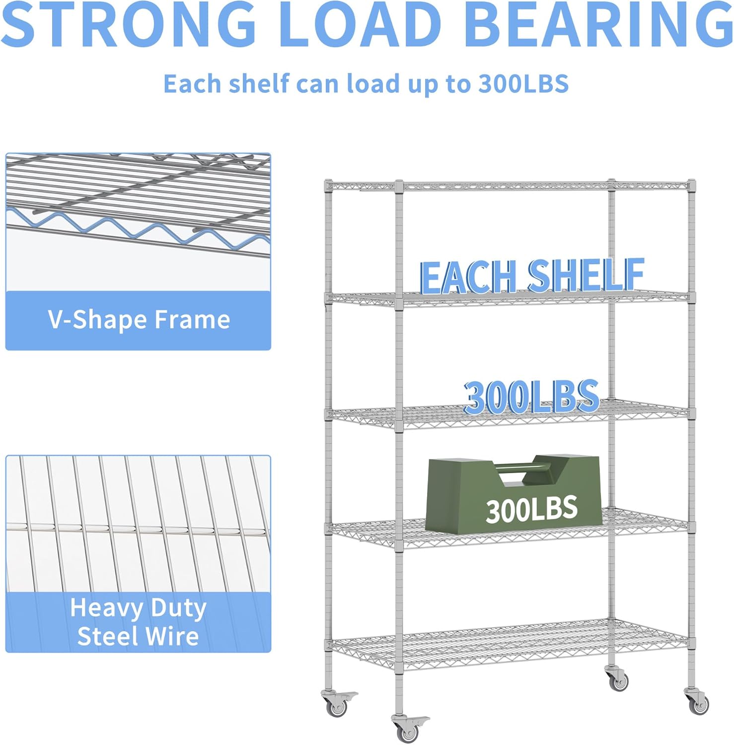 5 Tier Metal Shelving Unit with Wheels, 72" H x 48”W x 24”D Industrial Storage Shelves 1500 LBS Load Capacity, Steel Wire Storage Shelving for Garage, Kitchen, Pantry, Living Room
