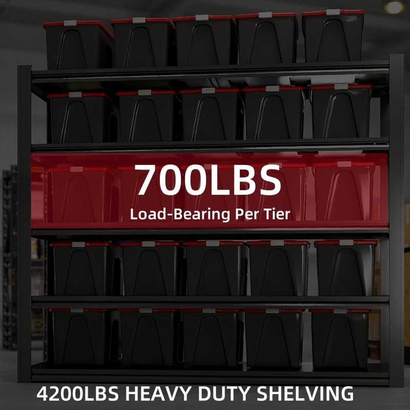 - ă4200LBS Capacity Heavy Duty Garage ShelvesăLI JIU HOME's heavy duty garage shelving unit has thickened double metal legs. Made of high-quality metal, each solid thickened metal shelving with 9 big ribs beneath can hold up to 700 lbs, with a total bearing capacity of 4200 lbs, which makes industrial garage shelves heavy duty more stable and solid than normal metal shelves for storage and more stuff can be stored