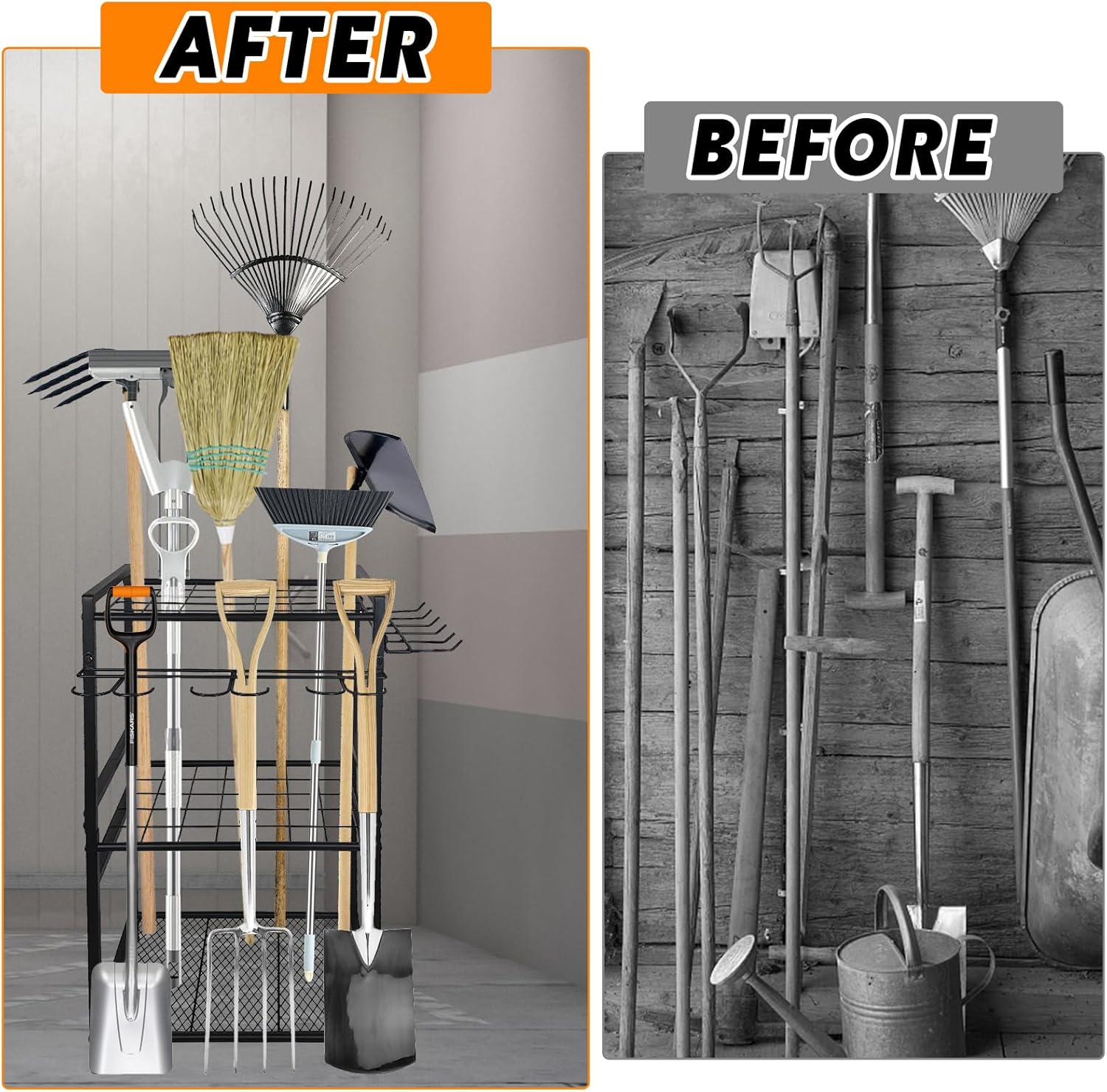 - Multifunctional Garage Storage: Garden organizer seamlessly adapts to garages, gardens, sheds, and backyards. It efficiently organizes gardening, yard maintenance, cleaning, and lawn tools. From shovels and leaf rakes to bow rakes, mops, and brooms
