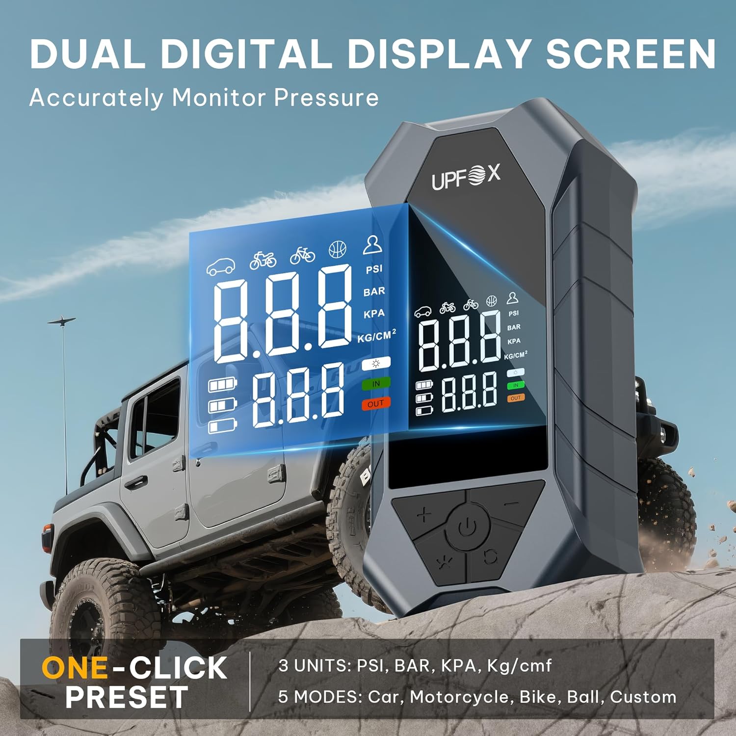 - 【LED DIGITAL DISPLAY & AUTO SHUT-OFF FUNCTION】:This portable tire inflator features a high-definition digital LCD screen that displays both real-time pressure and preset values (±1 PSI accuracy). The clear readout allows you to monitor tire pressure status at a glance. With the preset tire pressure function, the car tire air pump portable automatically shuts off upon reaching your target pressure, preventing over-inflation to ensure optimal tire performance and safety.