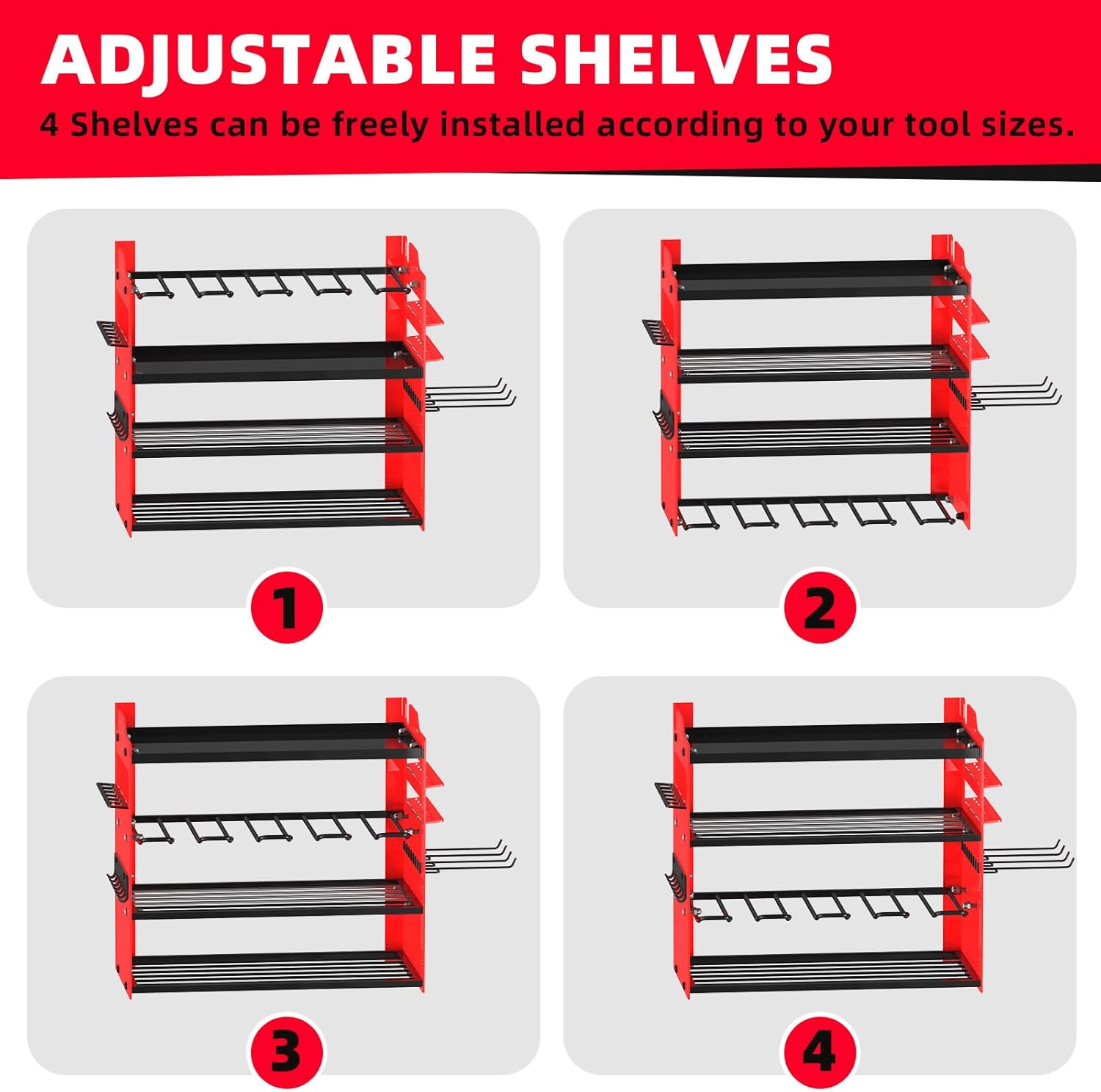 - 🌪️【WIDELY APPLICATION】This tool holder can store a variety of tools, from large power tools to smaller accessories, and can be easily mounted on nail boards, wooden walls, and concrete walls, ensuring easy access and improving workflow efficiency in various workplaces.Having everything on the wall means you can see and grab what you need quickly, reducing the time spent searching for tools or batteries. The adjustable compartments can significantly enhance its versatility. You can freely change the position of the compartments according to the different sizes or shapes of your tools.