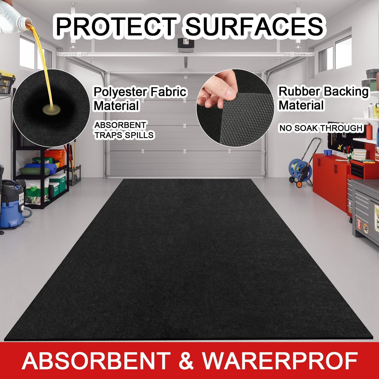 - Absorbent and Waterproof Protection: These garage floor mats absorb oil, brake fluid, and other automotive liquids, protecting your garage floor from stains and leaks. The slip-resistant, waterproof rubber backing keeps the pad rug in place, ideal for use under cars, motorcycle, and truck. Perfect for garage floor mats for under car, rubber floor mats, and driveway oil stain remover.