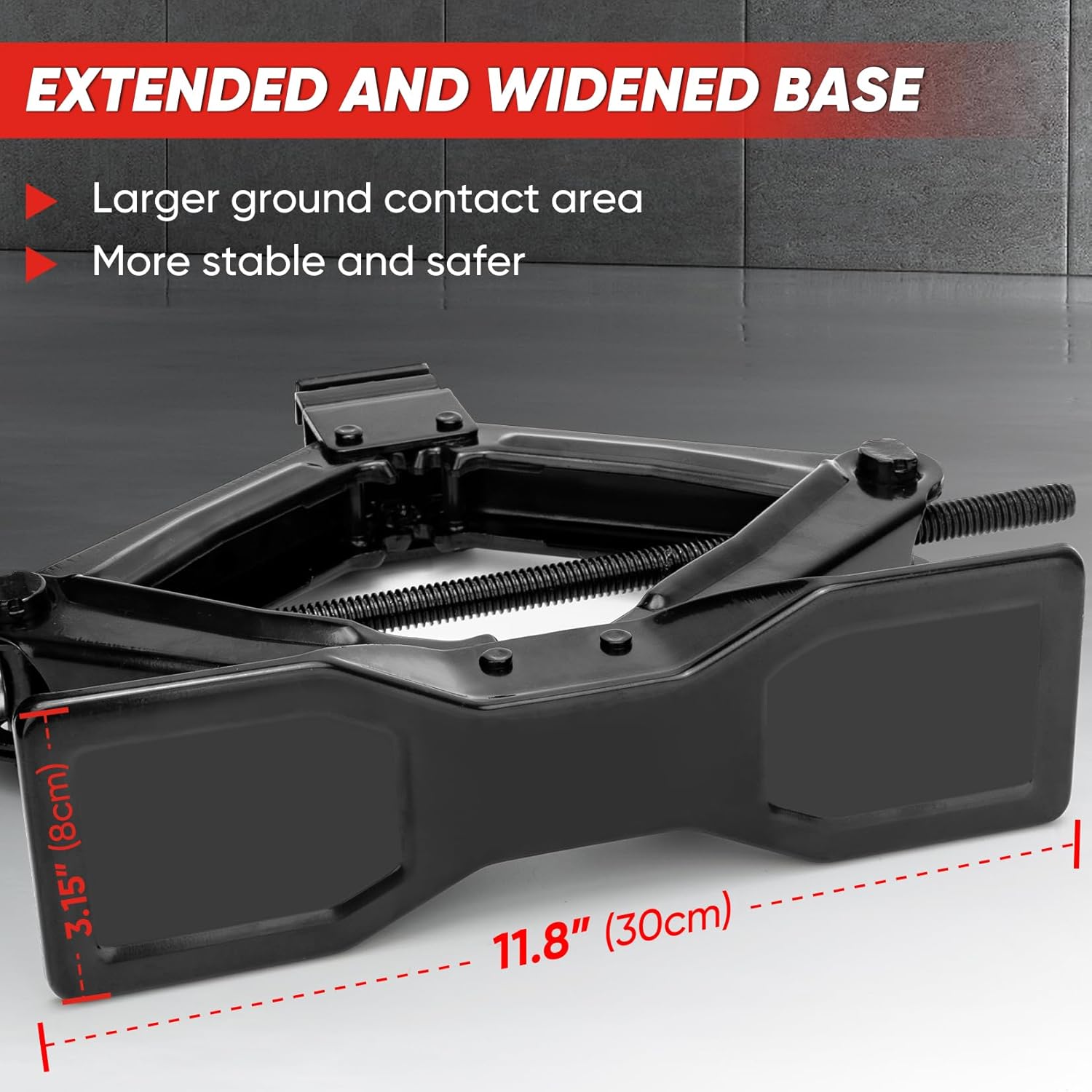 - [Extended & Widened Base] SHALL scissor jack boasts an extended, widened base for stability on various grounds, including dirt, ensuring smooth operation and fulfilling emergency roadside needs for most vehicles
