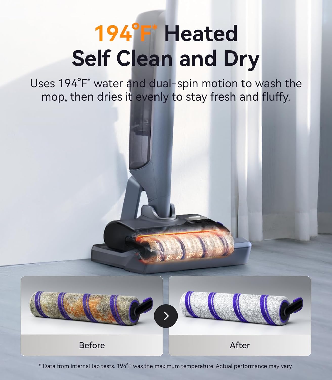 - Self-Cleaning in a Tap: The roller mop is thoroughly cleaned using water heated to a maximum of 194°F. Detergent is automatically dispensed, and the mop spins in different directions to scrub each bristle. The built-in heated bar evenly dries the mop like an iron, keeping it fluffy and fresh, while also drying the pipes and filters.