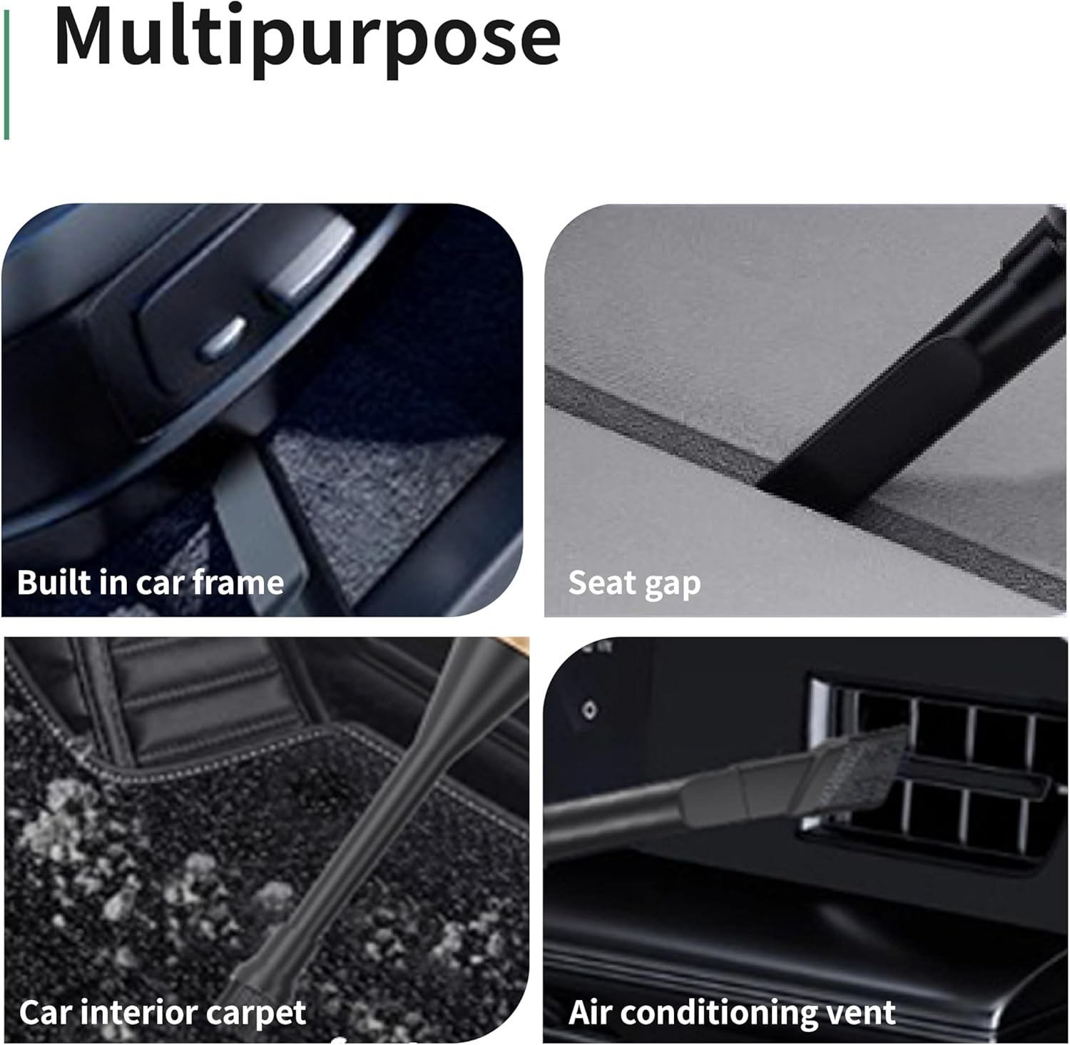 - 2-in-1 Multi-Function Car Vacuum: Keep your car spotless with the Car Cleaning Kit. This interior car cleaning kit includes a cordless vacuum cleaner with 4 versatile nozzles (crevice tool, brush nozzle, extension hose, and more) for blowing and suction functions. Easily switch between removing dust, crumbs, and pet hair or inflating small items like air mattresses. Perfect for detailing tight spaces like car seats, vents, and floor mats.