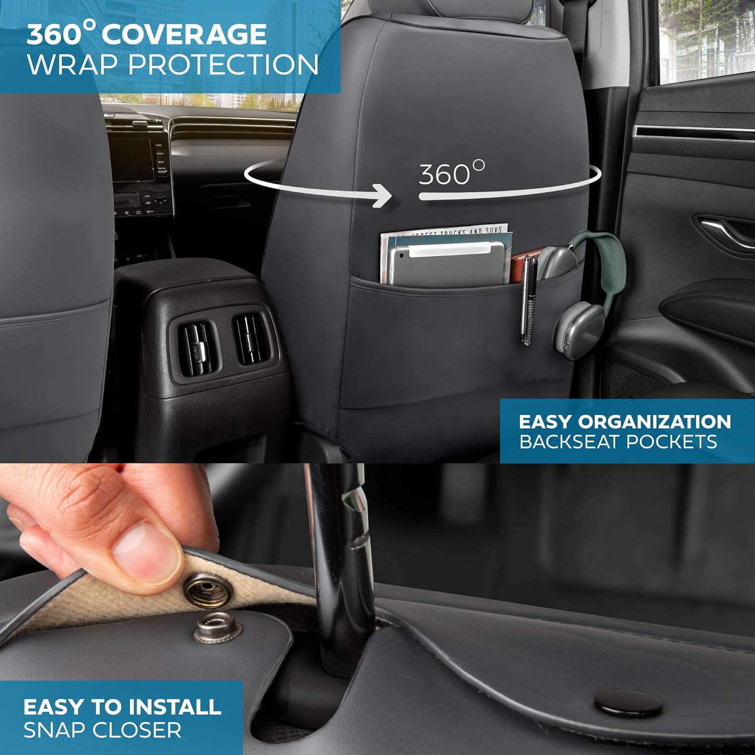 - LEATHER & SUEDE FOR ULTIMATE COMFORT & STYLE: Our premium leather and suede seat covers combine luxury with smart heat control. Unlike traditional leather seats that can become uncomfortably hot in the summer or too cold in the winter, our design offers a balanced solution. The suede covers all seated areas — including the backrest and cushion — providing a soft, temperature-neutral surface where it matters most. Napa leather completes the seat cover for a comfort meets elegance design.