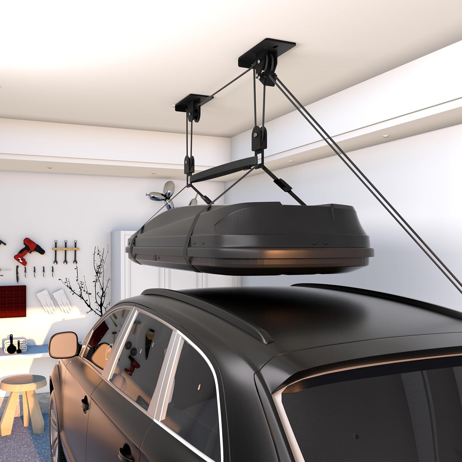 - QUICK & EASY INSTALLATION: Mount directly onto ceiling joists using the included premium hardware. From setup to daily use, our garage hoist for cargo box designed every detail to be intuitive and lasting.