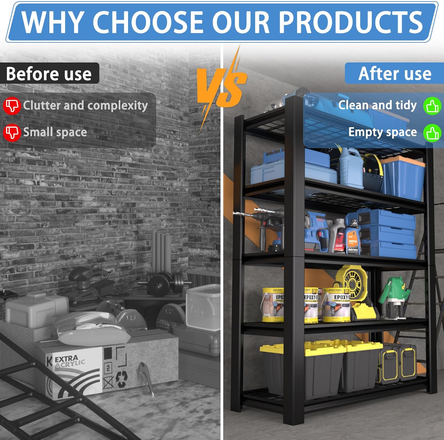 - Adjustable & Convertible for Flexible Storage: The 5-tier wire shelving unit allows you to adjust shelf height to fit tall or short items. It can also be split into two smaller racks or workbenches. Great for customizing garage, pantry, or warehouse storage layout.