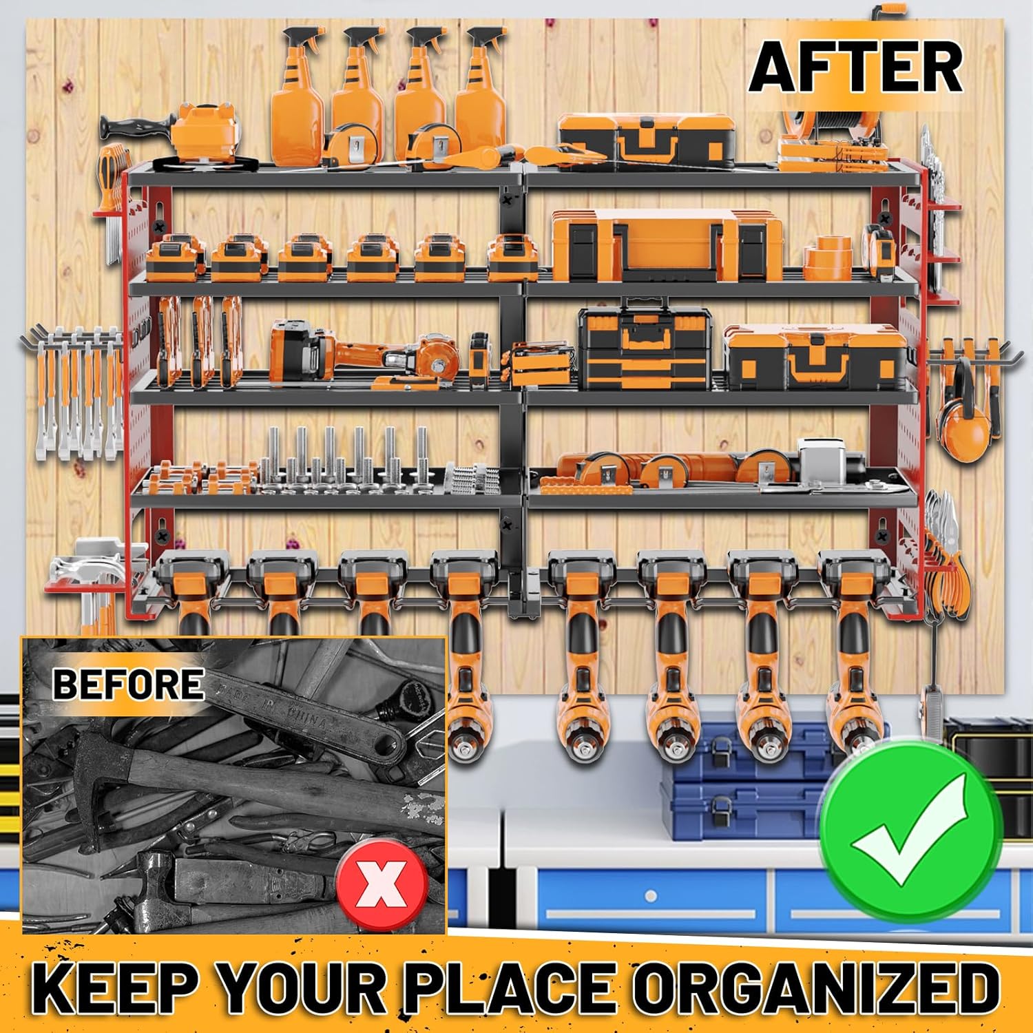 - 【Durable & Heavy-Duty】 Constructed from heavy-duty, compact steel metal, this power tool organizer wall mount features thickened steel wires and beams for exceptional strength and durability, resisting bending and breakage. This garage tool organizer boasts a load capacity of up to 300 lbs. All surfaces are meticulously smoothed and coated with a sleek black anti-rust finish, enhancing the tool rack's lifespan while protecting hands from scratches
